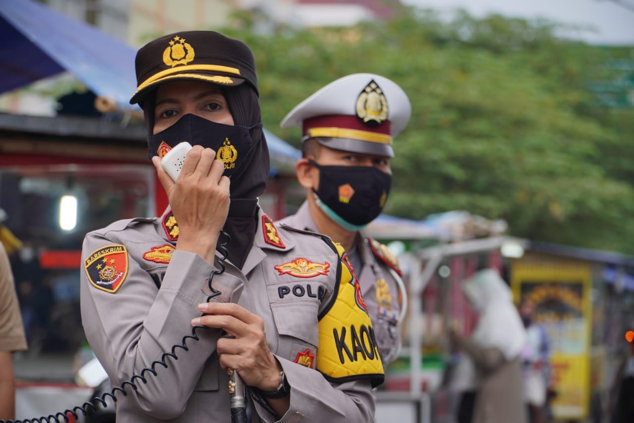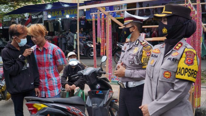 BANJAR, MEDIA OTONOMI INDONESIA – Berlokasi di Pasar Langensari Kota Banjar Kapolres Banjar AKBP Melda Yanny bersama Kasat Lantas AKP Purwadi, serta personel Sat Lantas dan Polsek Langensari sampaikan himbauan protokol kesehatan kepada warga masyarakat yang sedang ngabuburit, Sabtu (1/5/2021).