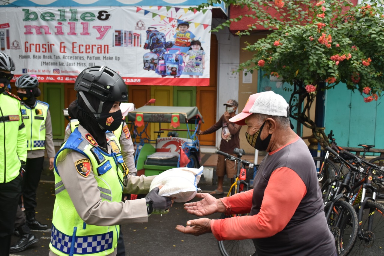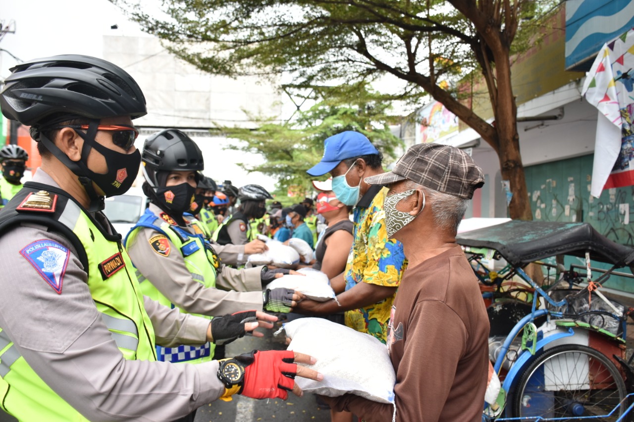 Rombongan melanjutkan patroli sepedanya menuju Simpang 4 Alun-alun Kota Banjar, di sana Kapolres Banjar beserta personil memberikan bantuan kemanusiaan berupa sembako kepada penarik becak yang sedang mangkal, begitu pun penarik becak yang sedang mangkal di Jalan Letjen Suwarto dihampiri rombongan dan diberikan bantuan.