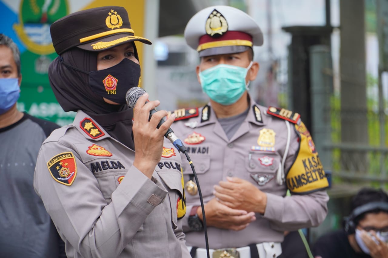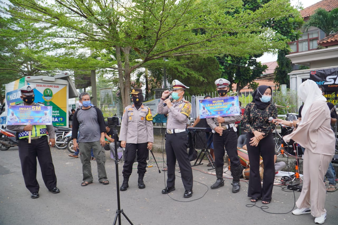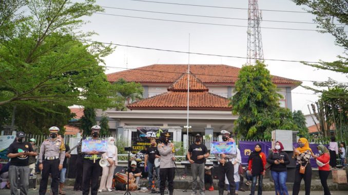 BANJAR, MEDIA OTONOMI INDONESIA – Berlokasi di depan Alun-alun Langensari, Kapolres Banjar AKBP Melda Yanny bersama Kasat Lantas AKP Purwadi serta Personel Lantas Polres Banjar hampiri grup musik yang tergabung dalam Persada Desa Kujangsari yang sedang menyanyikan lagu ‘Ayok Pakai Maskermu’ karya Satuan Lantas Polres Banjar, Minggu (2/5/2021).