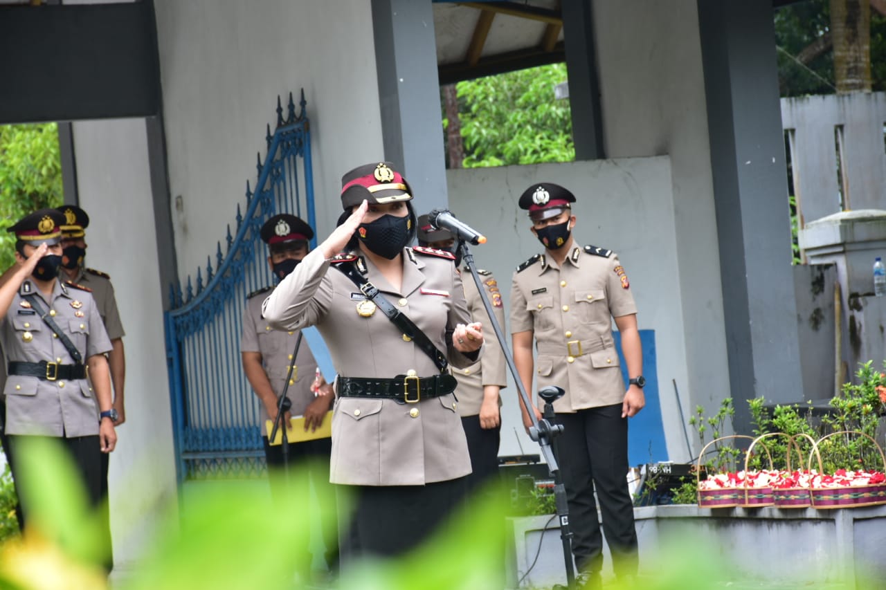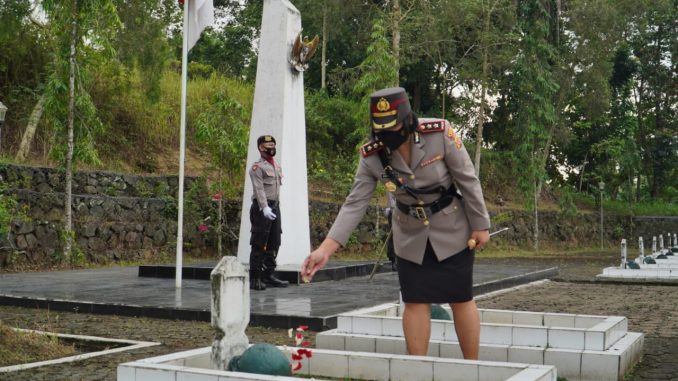 BANJAR, MEDIA OTONOMI INDONESIA – Berlokasi di Taman Makam Pahlawan Bahagia Kesuma Bangsa Desa Balokang Kec. Banjar Kota Banjar, Kapolres Banjar AKBP Ardiyaningsih pimpin upacara ziarah rombongan Polres Banjar dalam rangka HUT Bhayangkara ke-75 Tahun 2021, Rabu (30/6/2021).