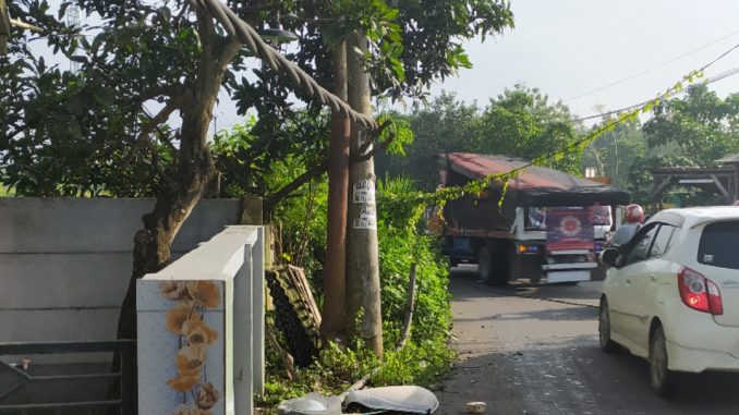 TANGERANG, MEDIA OTONOMI INDONESIA – Lepasnya tali pegangan Saluran Kabel Tegangan Menengah (SKTM) milik PLN mengakibatkan lampu penerangan jalan umum jatuh berantakan ke jalan dan kabel listrik melintang di tengah jalan, mengakibatkan area jalan Pinang menuju Cikasungka menjadi macet, Kamis (4/2/2021)