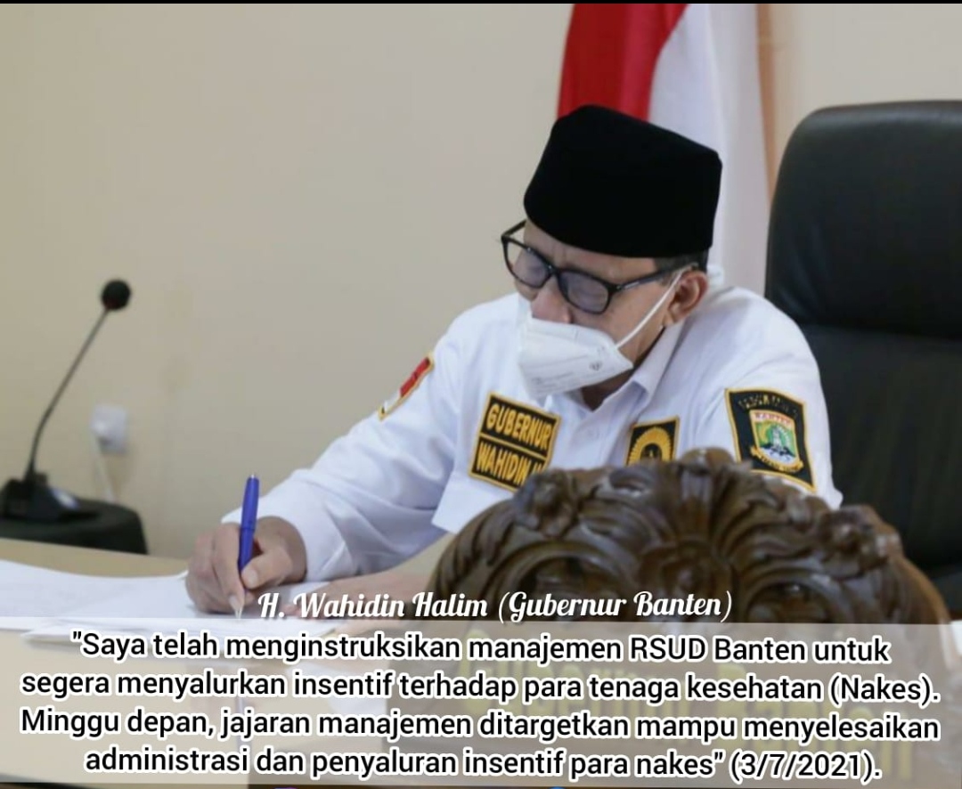 BANTEN, MEDIA OTONOMI INDONESIA – Gubernur Banten Wahidin Halim (WH) instruksikan manajemen Rumah Sakit Umum Daerah (RSUD) Provinsi Banten untuk segera menyalurkan insentif terhadap para tenaga kesehatan (Nakes). Minggu depan, jajaran manajemen ditargetkan mampu menyelesaikan administrasi dan penyaluran insentif para nakes.