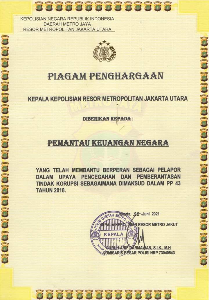 JAKARTA, MEDIA OTONOMI INDONESIA – PP No. 43 Tahun 2018 tentang Tata Cara Pelaksanaan Peran Serta Masyarakat dan Pemberian Penghargaan dalam Pencegahan dan Pemberantasan Tindak Pidana Korupsi. Atas dasar PP 43 tahun 2018 ini, Kapolres Jakarta Utara Kombes Pol. Guruh Arif Darmawan, S.I.K., M.H. memberikan Penghargaan kepada Pemantau Keuangan Negara (PKN) yang aktif dan atau yang telah melaporkan dugaan korupsi ke pihak berwajib/Polri. Penghargaan diberi kepada PKN di Mako Polres Metro Jakarta Utara Jl. Yos Sudarso No.1 Rawabadak Utara, Koja, Jakarta Utara, Selasa, 29/6/2021.