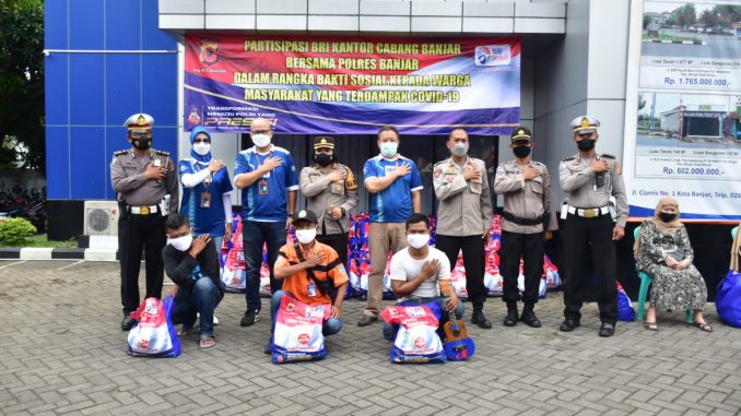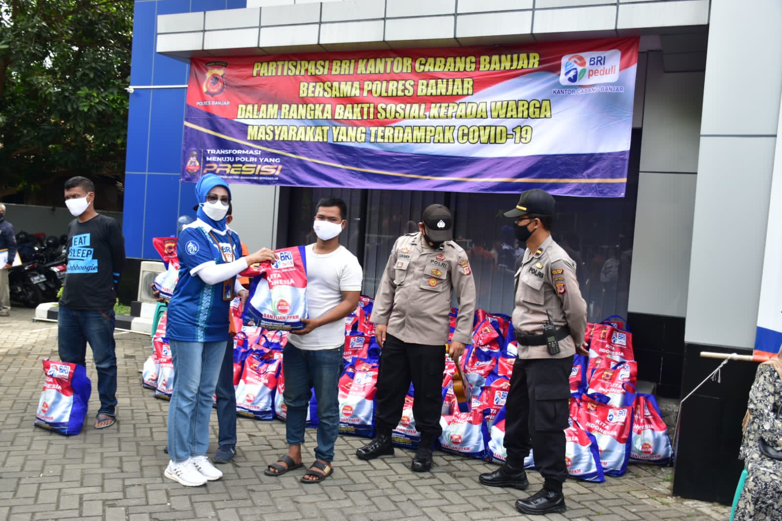 Kegiatan Partisipasi Bank BRI Cabang bersama Polres Banjar dalam rangka Bantuan Sosial berupa sembako, dengan sasaran warga Kota Banjar yang terdampak pandemi covid 19 terutama para pengayuh beca, ojeg pangkalan, pengamen jalanan. Dengan maksud dan tujuan untuk meringankan beban hidup selama pandemi.