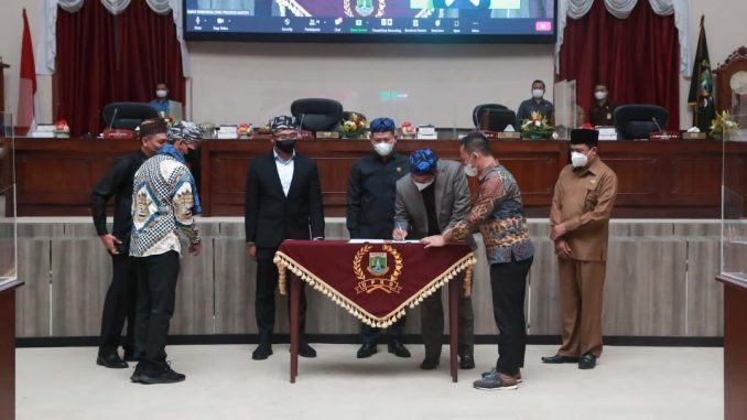 Serang, mediaotonomiindonesia.com – Rancangan Peraturan Daerah tentang Susunan Kelembagaan, Pengisian Jabatan, dan Masa Jabatan Kepala Desa Adat disetujui menjadi Peraturan Daerah dalam Rapat Paripurna DPRD Provinsi Banten di Gedung DPRD Provinsi Banten, Kawasan Pusat Pemerintahan Provinsi Banten (KP3B), Kota Serang, Kamis (3/2/2022). Dengan disetujui Rancangan Peraturan Daerah ini, maka Pemprov Banten telah melaksanakan amanat Undang-Undang Nomor 6 Tahun 2014 tentang Desa.
