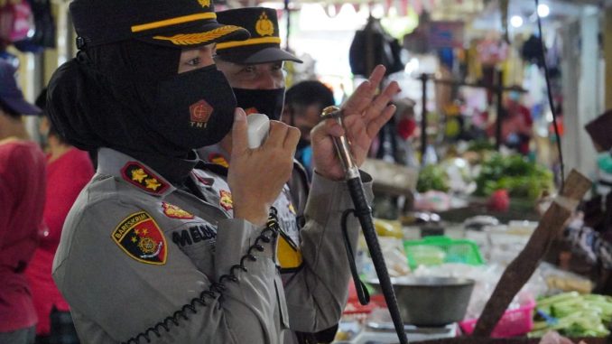 BANJAR, MEDIA OTONOMI INDONESIA – Menyikapi peningkatan kasus terkonfirmasi Covid-19 di Kota Banjar masih menunjukan angka peningkatan, Kapolres Banjar AKBP Melda Yanny kembali turun ke lapangan menyampaikan himbauan protokol kesehatan kepada warga masyarakat secara langsung, Senin (5/4/2021).