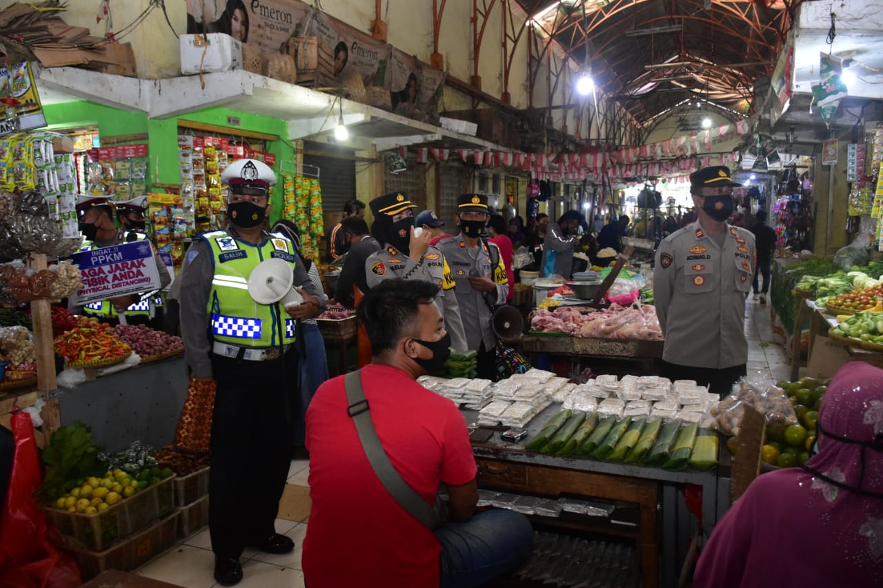 Dengan didampangi Kasat Binmas, Perwira, dan Personel Polres Banjar pagi tadi mendatangi Pasar Kota Banjar, di sana Kapolres Banjar secara langsung menyampaikan himbauan protokol kesehatan dengan mengingat 5M yakni memakai masker, mencuci tangan dengan menggunakan sabun, menjaga jarak, menghindari kerumunan, dan membatasi mobilitas.
