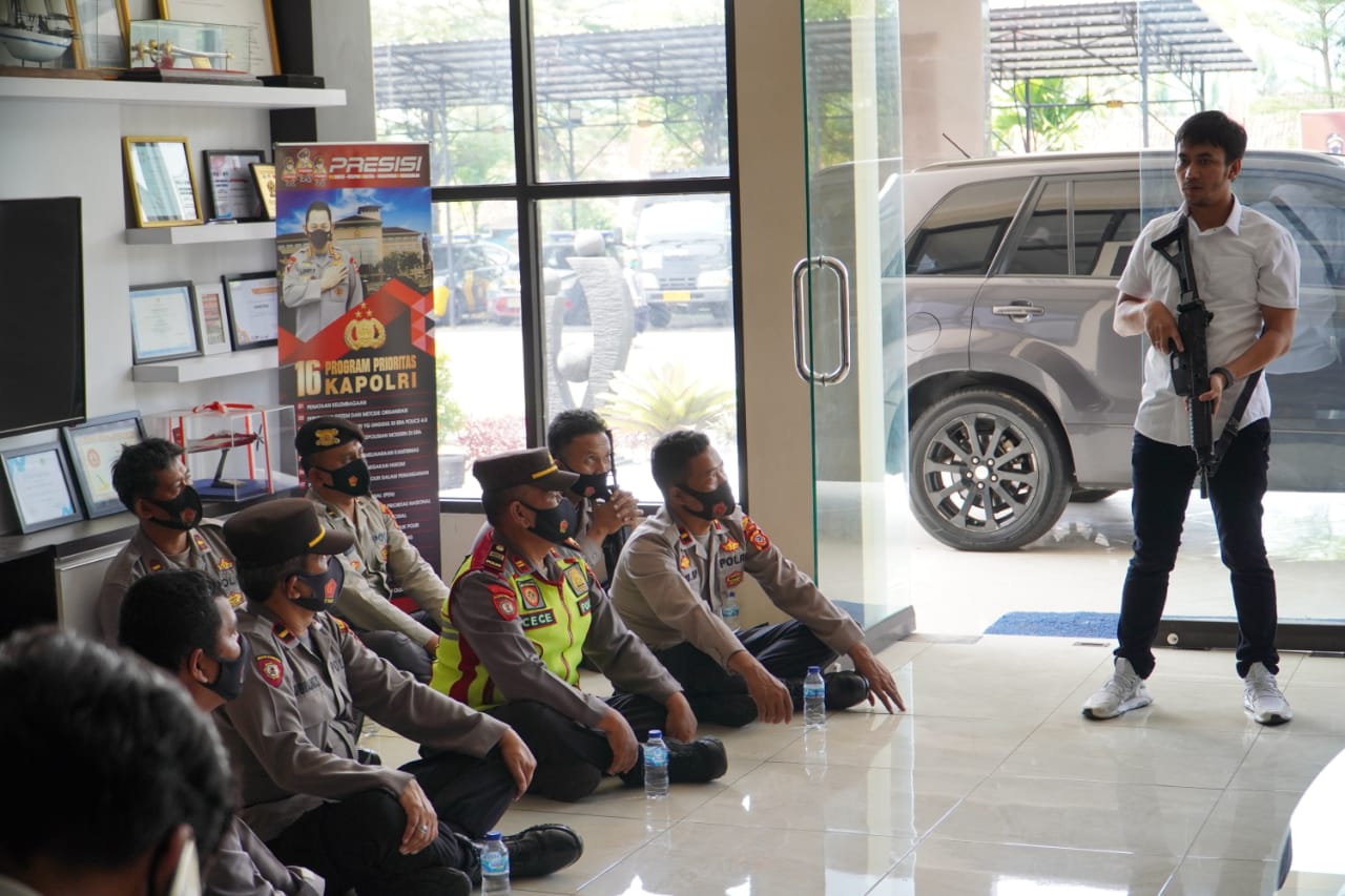 Tadi Kasat Reskrim sebagai instruktur pelatihan memperagakan dan mempraktekan cara dan teknik-teknik untuk Personel Polres Banjar dan Polsek Jajaran dalam menghadapi ancaman dari orang yang berniat menyerang anggota maupun Mako, ucap Kapolres.