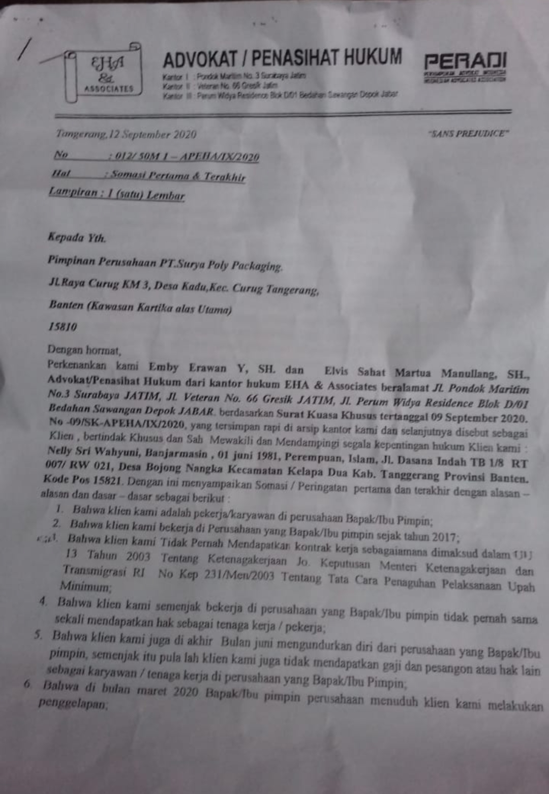 Kuasa Hukum Embay Erawan Y, SH dkk telah melayangkan surat Somasi pertama dan terakhir dengan No : 021/50 M 1 – APEHA/IX/2020, Hari Sabtu (12/9/2020) kepada perusahaan PT. Surya Polly Packaging yang beralamat di Jln Raya Curug KM 3. Desa Kadu, Kecamatan Curug, Kab.Tangerang.