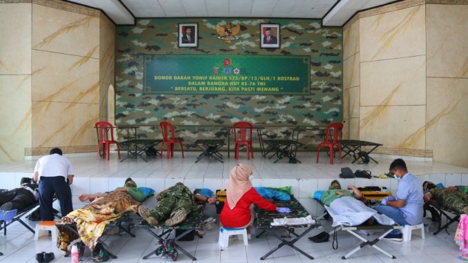 Banjar, mediaotonomiindonesia.com – Dalam rangka memperingati HUT TNI Ke-76 Tahun 2021, Yonif Raider 323/BP/13/GLH/1 Kostrad melaksanakan Bhakti Sosial dengan menggelar kegiatan donor darah yang bekerja sama dengan PMI, Subdenpom III/2-4 serta instansi pemerintahan Kota Banjar di Aula Dewata Cengkar pada pukul 08.00 WIB, Selasa, (5/10/2021)