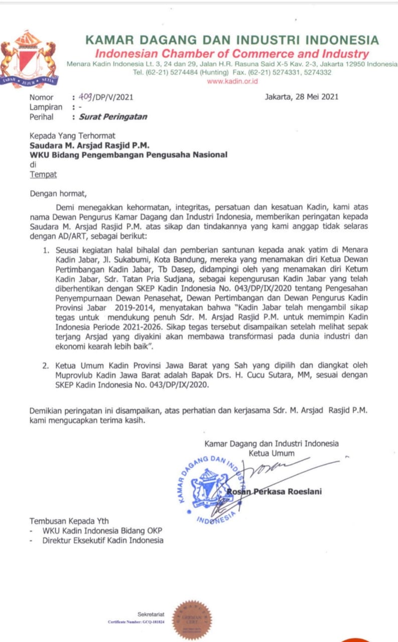 Caketum Arsyad Rasjid dinilai tidak taat aturan, sehingga keluar Surat Peringatan yang ditandatangani oleh Ketua Umum Kadin Rosan Perkasa Roeslani.