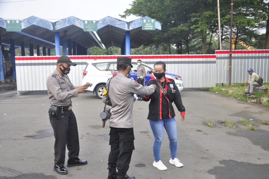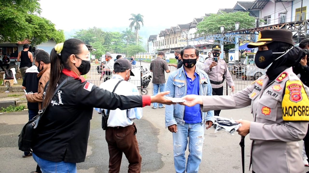 BANJAR, MEDIA OTONOMI INDONESIA – Kepala Kepolisian Resor Banjar AKBP Melda Yanny bersama para Perwira Polres Banjar mendatangi Terminal Kota Banjar menyampaikan himbauan protokol kesehatan, serta membagikan masker kepada warga masyarakat dan calon penumpang di sekitar terminal, Senin (8/3/2021).