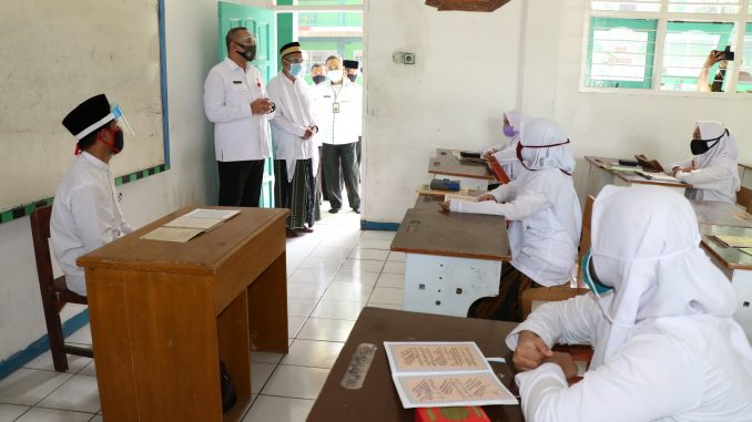 TANGERANG, MOI – Bupati Ahmed Zaki Iskandar meninjau Simulasi Protokol Kesehatan Covid-19 dilingkungan Pesantren Tarbiyatul Mubtadin Desa Pasrinangka Kecamatan Tigaraksa Kabupaten Tangerang, Senin ( 8/07/20)