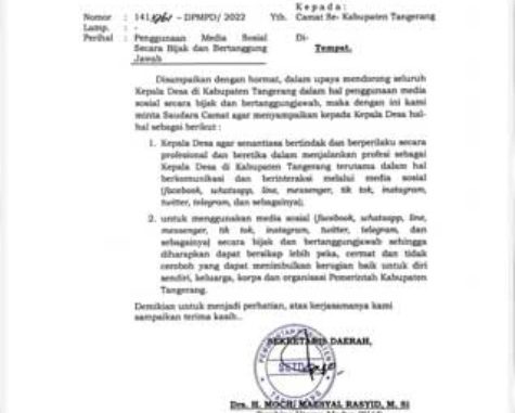 Surat yang bernomor 141/961/DPMPD/2022 tersebut di keluarkan Pemkab Tangerang dalam upaya mendorong seluruh kepala desa di Kabupaten Tangerang dalam hal penggunaan media sosial secara bijak dan bertanggung jawab. Selasa (8/3/2022).