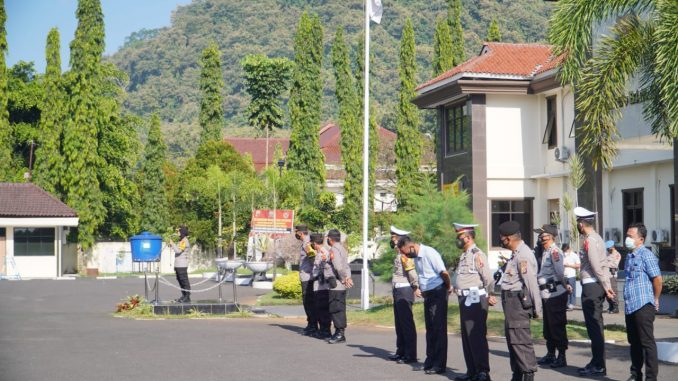 Kegiatan apel pagi tersebut dihadiri juga oleh Wakapolres Banjar, Pejabat Utama Polres Banjar, Para Perwira, dan diikuti oleh Seluruh Personel yang tidak terlibat langsung dengan Operasi Ketupat Lodaya Tahun 2021, Minggu (9/5/2021).