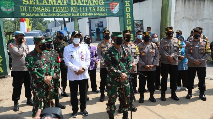 TANGERANG, MEDIA OTONOMI INDONESIA – Kapolresta Tangerang Kombes Pol Wahyu Sri Bintoro mendampingi kunjungan kerja (kunker) Pangdam Jaya Mayjen TNI Mulyo Aji dan Kapolda Banten Irjen Pol Dr Rudy Heriyanto Adi Nugroho, SH, MH, MBA, Kamis (8/7/2021). Pangdam Jaya dan Kapolda Banten meninjau pelaksanaan TMMD di Kampung Daraham, Desa Jambe, Kecamatan Jambe, Kabupaten Tangerang.