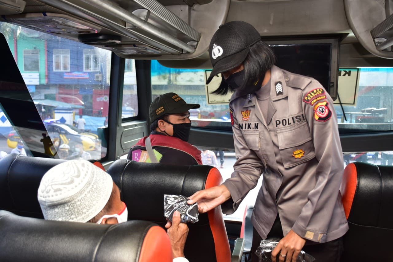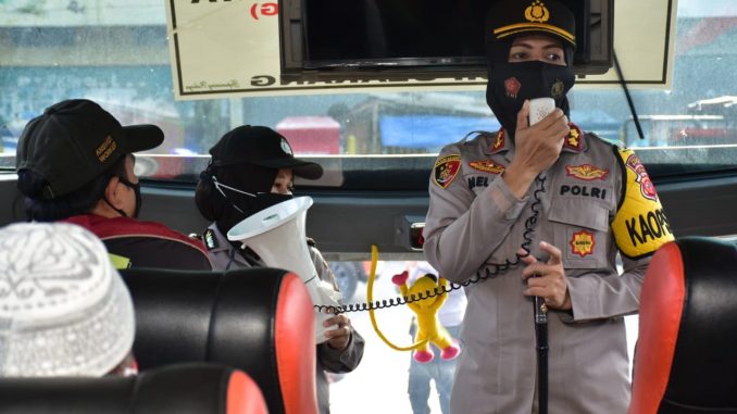 BANJAR, MEDIA OTONOMI INDONESIA – Kepala Kepolisian Resor Banjar AKBP Melda Yanny bersama Polwan Polres Banjar, mendatangi Terminal Kota Banjar menyampaikan himbauan protokol kesehatan serta membagikan masker di dalam bus, Kamis (11/3/2021).