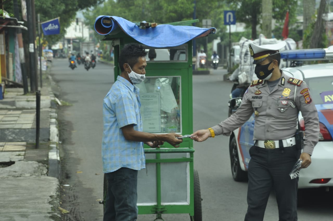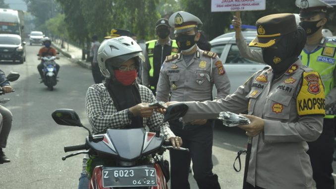 Kali ini Kapolres Banjar menghampiri langsung para pengguna jalan yang ditemui di Jalan-jalan protokol kota Banjar dan bagikan masker.