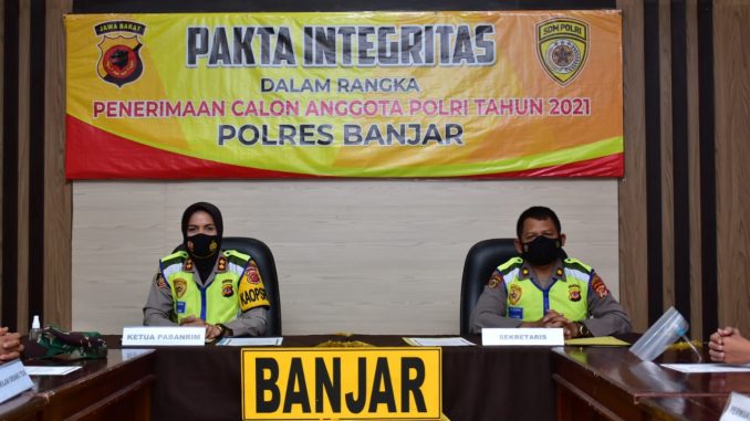 Dalam pelaksanaan Fakta Integritas dan pengambilan sumpah di Polres Banjar tersebut dipimpin oleh Kapolres Banjar, dengan didampingi Kabag Sumda Polres Banjar, dan diikuti oleh Panitia Penerimaan anggota Polri, para orang tua, dan para Calon anggota Polri Tahun Anggara 2021.