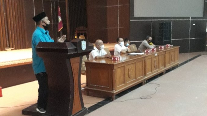 Salah seorang pedagang pasar Hj. Rani memperlihatkan kekecewaannya diluar aula, dia berteriak agar aturan PPKM Darurat tidak menyengsarakan para pedagang kecil seperti dirinya. (Yudhi’s)