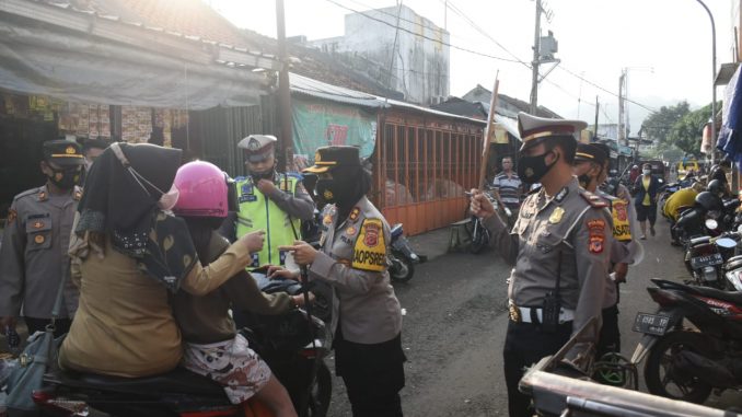 BANJAR, MEDIA OTONOMI INDONESIA – Kapolres Banjar AKBP Melda Yanny, bersama Kasat Binmas Polres Banjar Iptu Suharno, Perwira Lantas serta Personel Polres Banjar berjalan kaki di seputar Jalan Rd. Hamara Efendi sampai Pasar Banjar menyampaikan imbauan protokol kesehatan dan PPKM berskala mikro, Senin (15/02/2021).