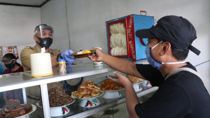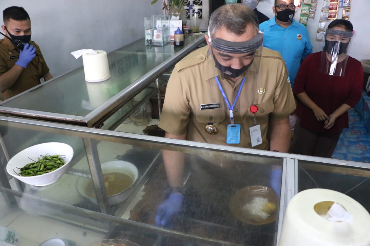 Dalam kesempatan tersebut Bupati Zaki melakukan simulasi dan mencontohkan bagaimana dalam melayani pembeli dengan masker dan pelindung wajah yang hendak makan di Warung Tegal (Warteg) di pasar Tigaraksa.