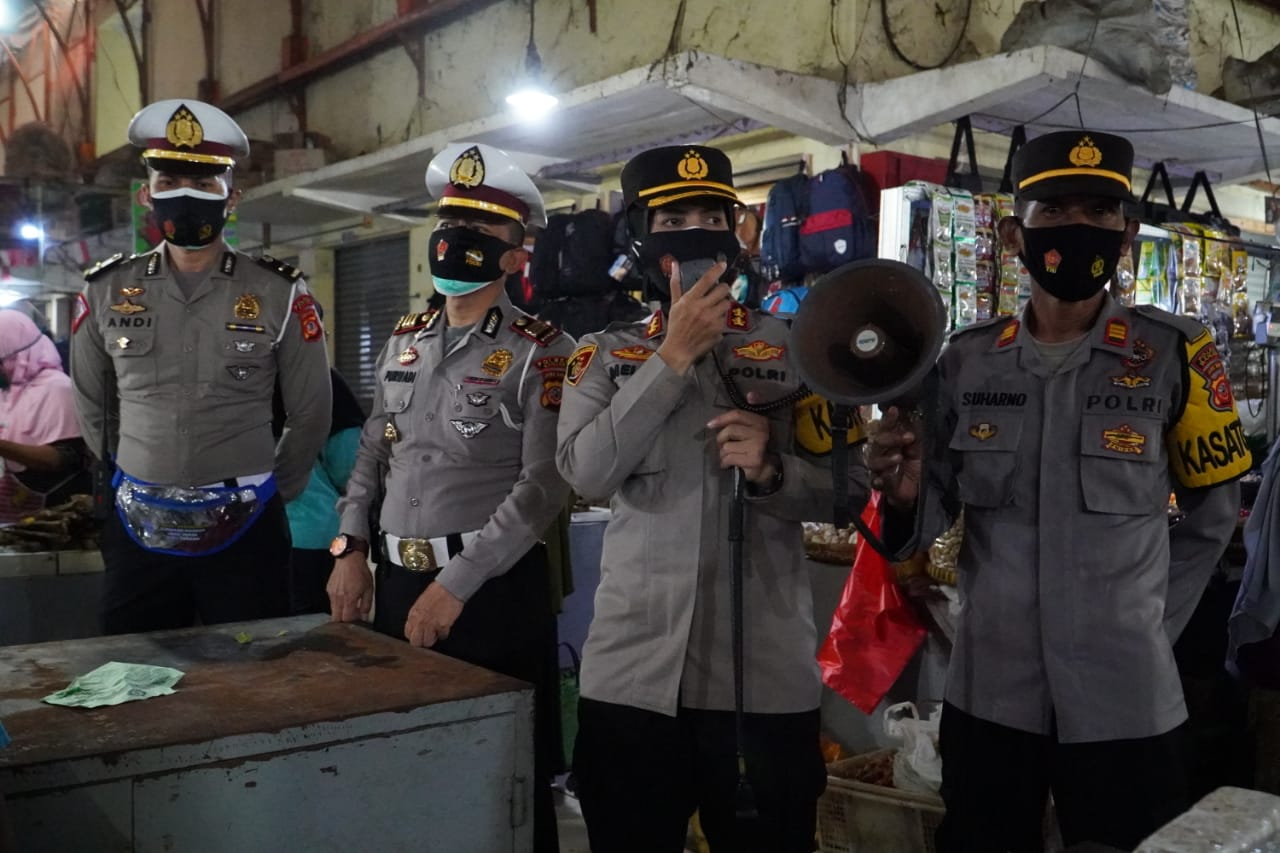 Kapolres beserta para personel berkeliling di dalam pasar dan membagikan masker kepada warga masyarakat.