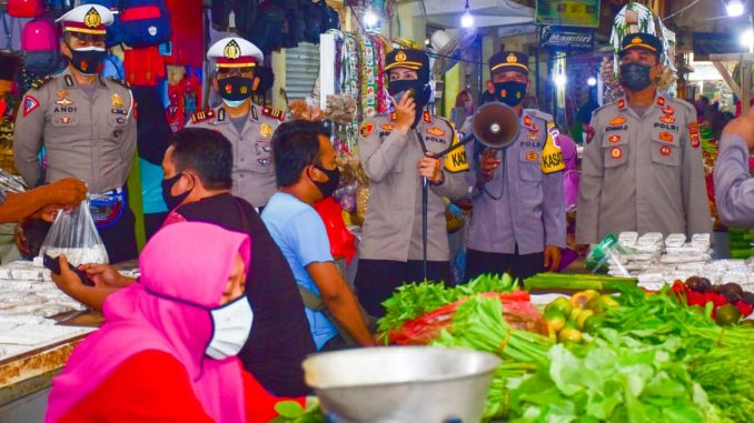 “Terlebih di pasar ini, baik pembeli maupun pedagang harus tetap jaga jarak, jangan berdesak-desakan, demi memutus penyebaran covid-19, masker harus selalu dipakai, jangan hanya kalau ada petugas” kata Kapolres kepada warga masyarakat pasar dengan pengeras suara.