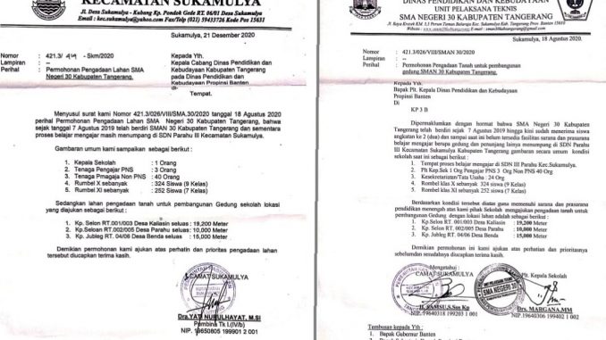“Tak hanya itu, lahan di Desa Kaliasin juga sudah disetujui oleh tokoh masyakat, yakni KH Jasmaryadi, dan lahan itu sudah diusulkan sejak zaman mantan Camat Sukamulya, H.Samsu tertanggal 25 Agustus 2020 kepada Gubernur Banten melalui kepala Dindikbud Banten, dengan nomor surat 590/194-Kec/VII/2020 perihal rekomendasi lahan pembangunan SMAN 30 Kabupaten Tangerang asal aset sekolah induk SMAN 19 Kabupaten Tangerang,”terang Mulyadi.
