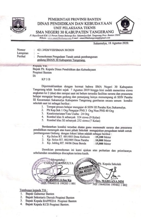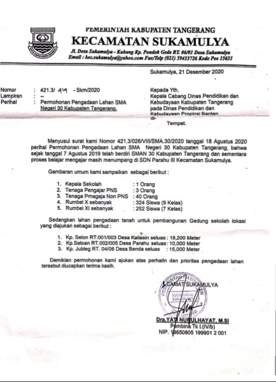 Ia menjelaskan, padahal sebelumnya pihak Kecamatan telah mengusulkan tiga lokasi lahan untuk dibangun gedung SMAN 30 Kabupaten Tangerang yakni di :