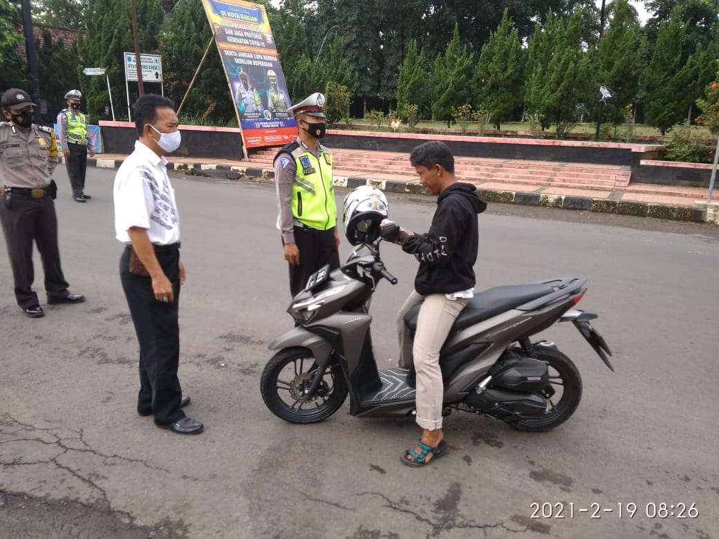 BANJAR, MEDIA OTONOMI INDONESIA – Berlokasi di jalan Cimaragas – Banjar perbatasan Ampelkoneng Kelurahan Situbatu Kecamatan Banjar Personel Polsek Banjar Polres Banjar melaksanakan operasi yustisi penegakan Disiplin Protokol kesehatan, Jum’at (19/02/2021).