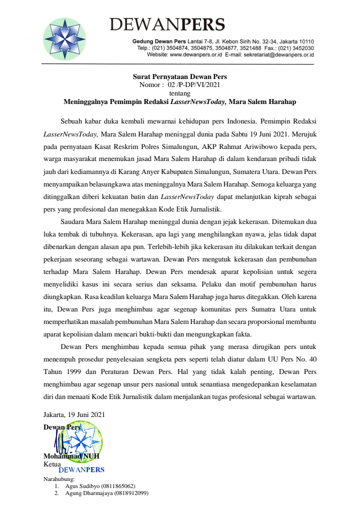 Marsal Harahap Wartawan, Pemred LasserNewsToday Dibunuh, Dewan Pers : “Komunitas Pers Sumatera Utara Bantu Aparat Kepolisian Cari Bukti Dan Ungkap Fakta”