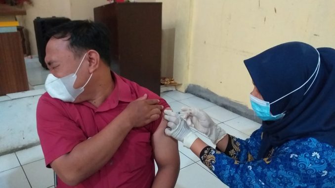 Monitoring pelaksanaan vaksin dilaksanakan oleh Bhabinkamtibmas Kelurahan Hegarsari, Aipda One Suherman dengan petugas vaksin dari UPTD Puskesmas Pataruman 1,