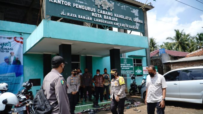 Banjar, mediaotonomiindonesia.com – Konsistensi Polres Banjar dalam menyukseskan pencapaian vaksinasi herd imunity 70% di kota Banjar terus dilakukan, salah satunya dengan menggelar gerai vaksinasi di Sekretariat Pengurus Cabang Nahdlatul Ulama (PCNU) Kota Banjar, di Lingkungan Panatasan Desa Mulyasari Kecamatan Pataruman, Rabu (20/10/2021).