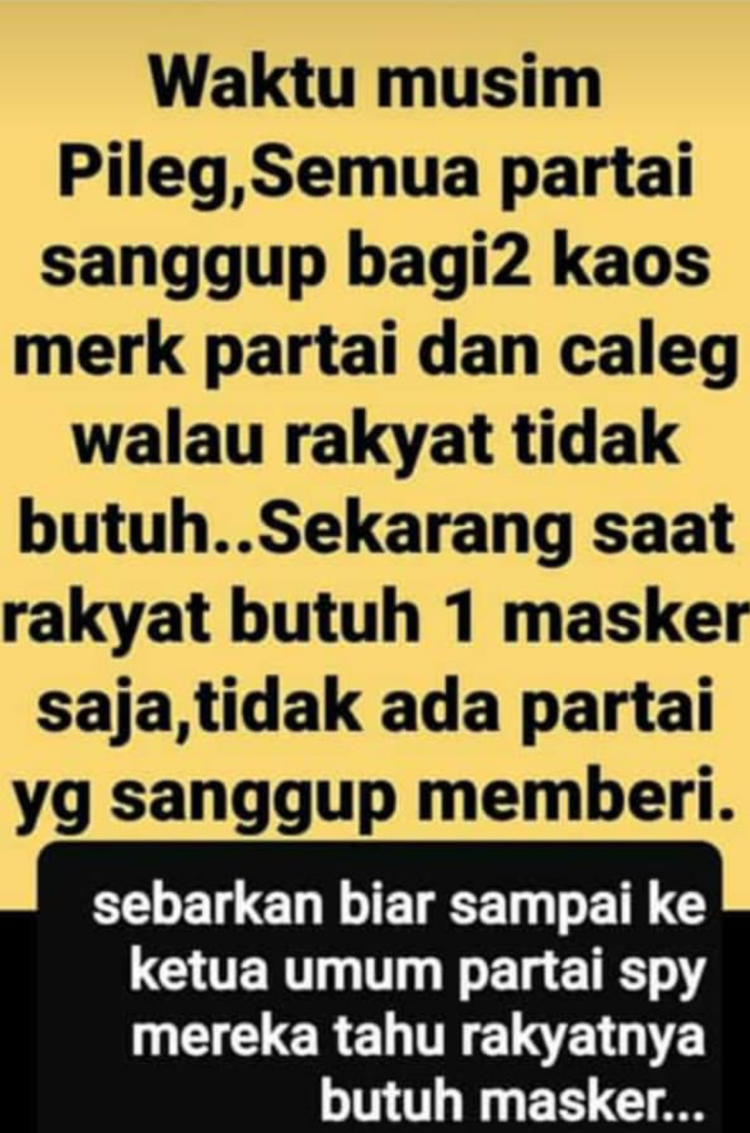 Dengan kesulitan inilah masyarakat membutuhkan dukungan atau bantuan dari anggota dewan, dan tidak sedikit dari masyarakat mengkritik partai partai seperti yang banyak beredar di medsos : “WAKTU MUSIM PILEG, SEMUA PARTAI SANGGUP BAGI BAGI KAOS MEREK PARTAI DAN CALEG WALAU RAKYAT TIDAK BUTUH ..SEKARANG SAAT RAKYAT BUTUH 1 MASKER SAJA, TIDAK ADA PARTAI YANG SANGGUP MEMBERI.”