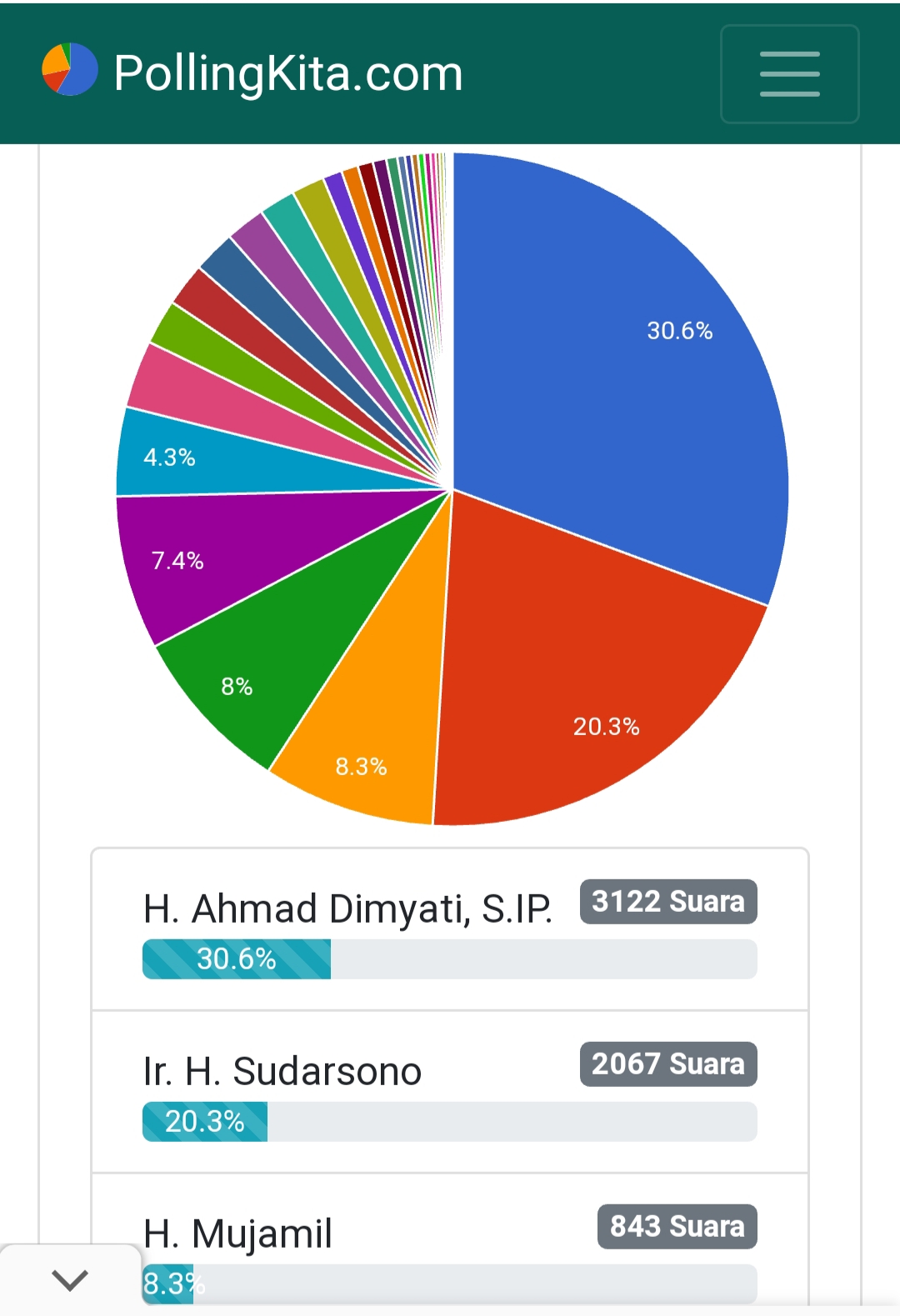 Urutan tiga besar hasil poling tersebut yaitu, 1. H. Akhmad Dimyati 3122, 2. Ir. H. Sudarsono 2067, 3. H. Mujamil 843.