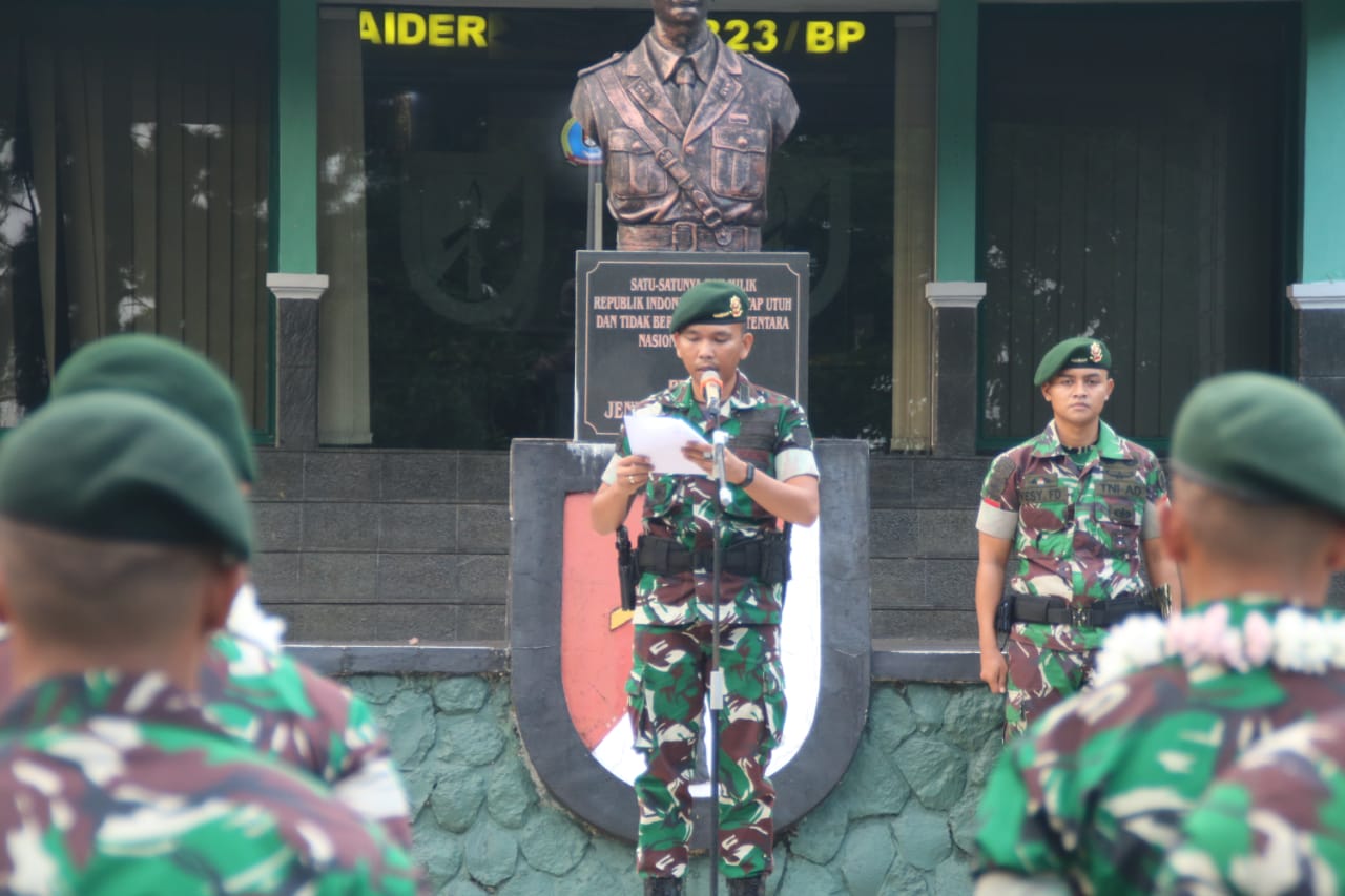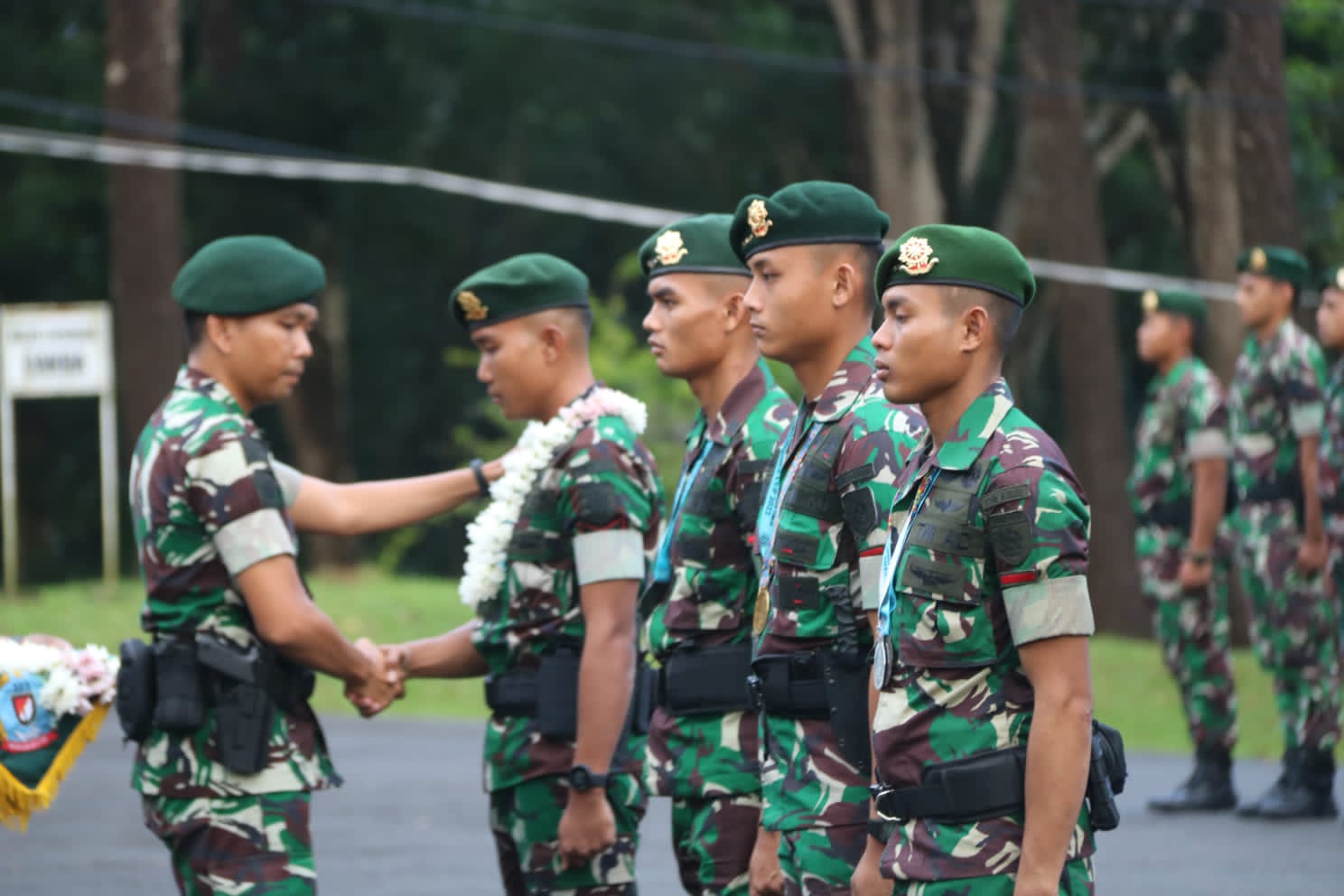 Acara tradisi dilanjutkan dengan pengalungan bunga oleh Pimpinan Acara Komandan Kompi Bantuan Kapten Inf Edi Riwanto, dan dilanjutkan dengan ucapan selamat oleh seluruh Prajurit Yonif Raider 323/BP.