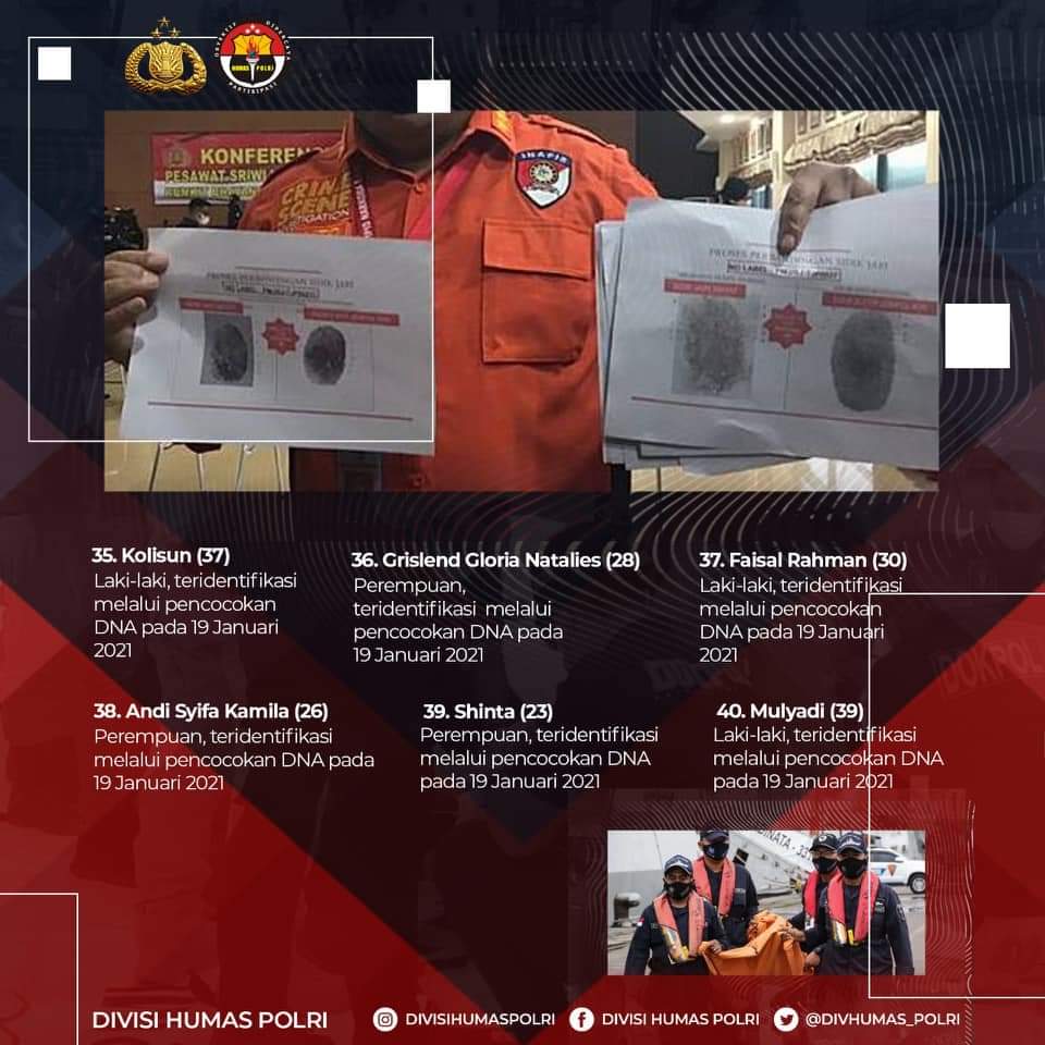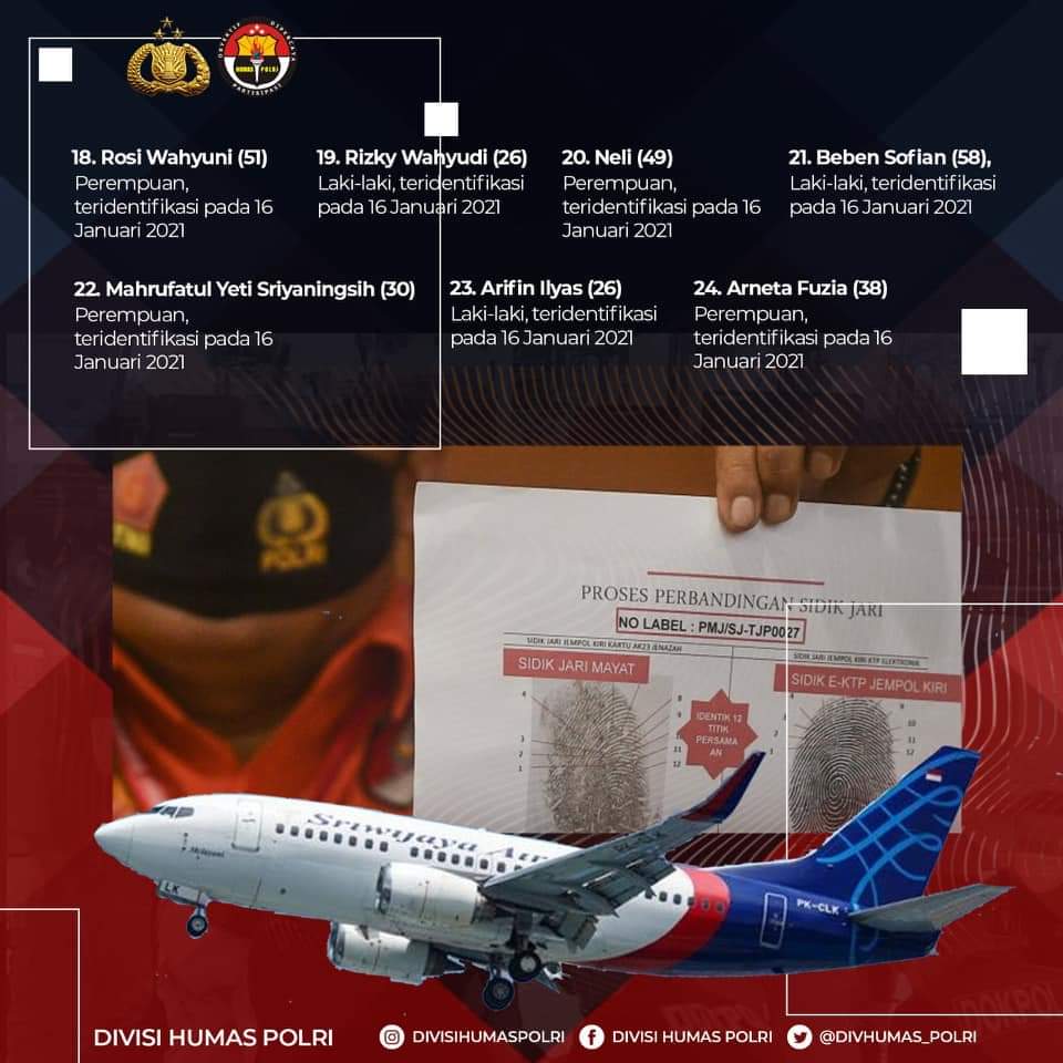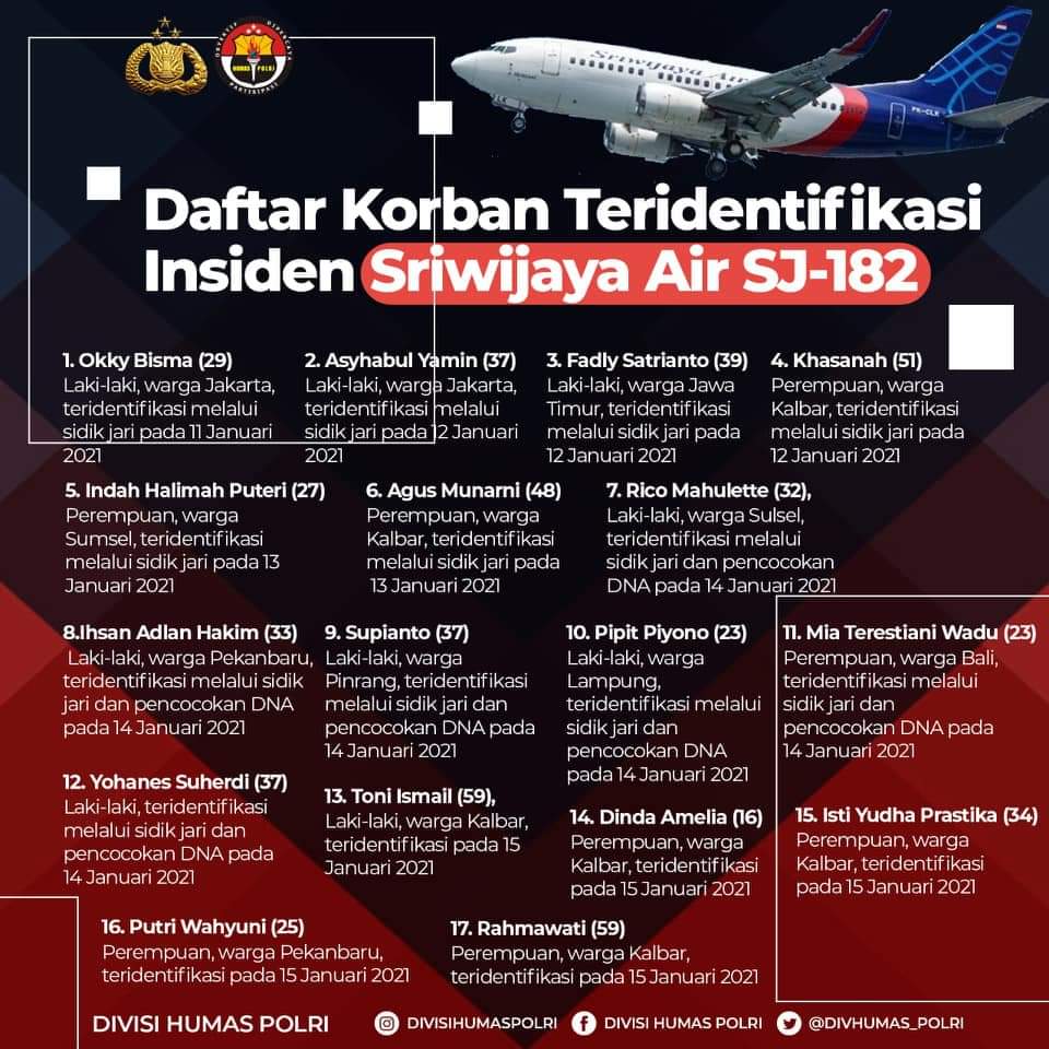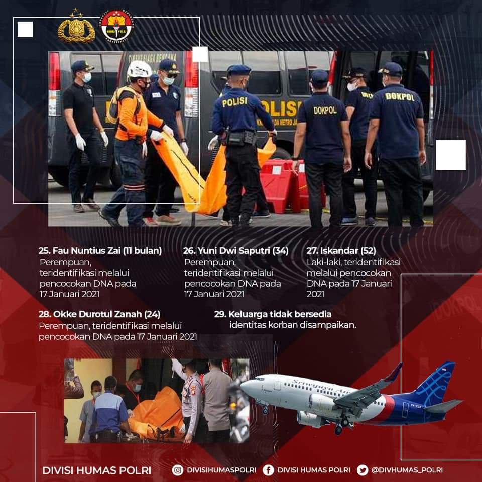 Update : Korban Jatuhnya Pesawat SJ-182 Yang Berhasil Teridentifikasi DVI Polri