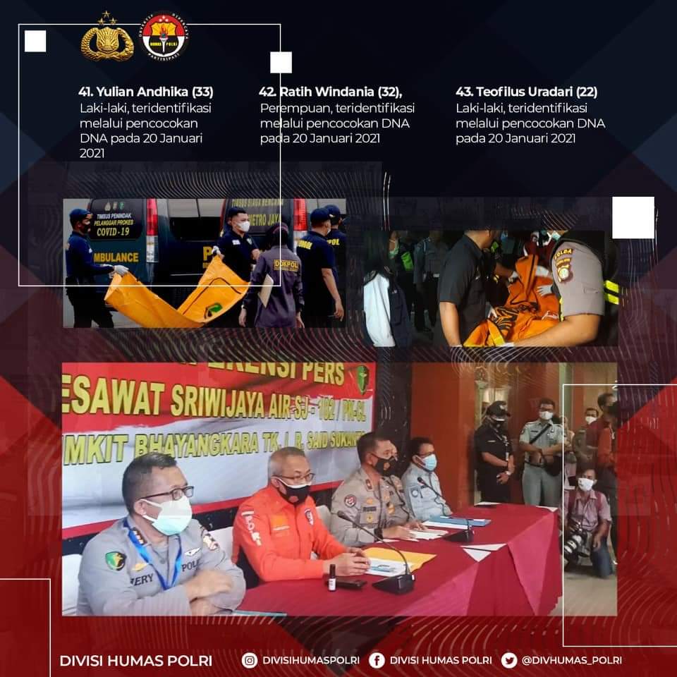 Hingga hari Sabtu (23/1/2021) tim Disaster Victim Identification (DVI) Polri telah berhasil mengidentifikasi sebanyak 49 korban atas insiden jatuhnya pesawat Sriwijaya Air SJ-182.