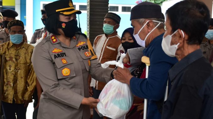Banjar – Kapolres Banjar AKBP Ardiyaningsih bersama Kepala Dinas Sosial, Camat Pataruman, Kapolsek Pataruman, Dan Ramil Langensari 1325, Kasat Samapta Polres Banjar, Ketua Disabilitas Kota Banjar salurkan paket Sembako kepada penyandak disabilitas kota Banjar di Kecamatan Pataruman Kota Banjar, Selasa (24/8/2021).