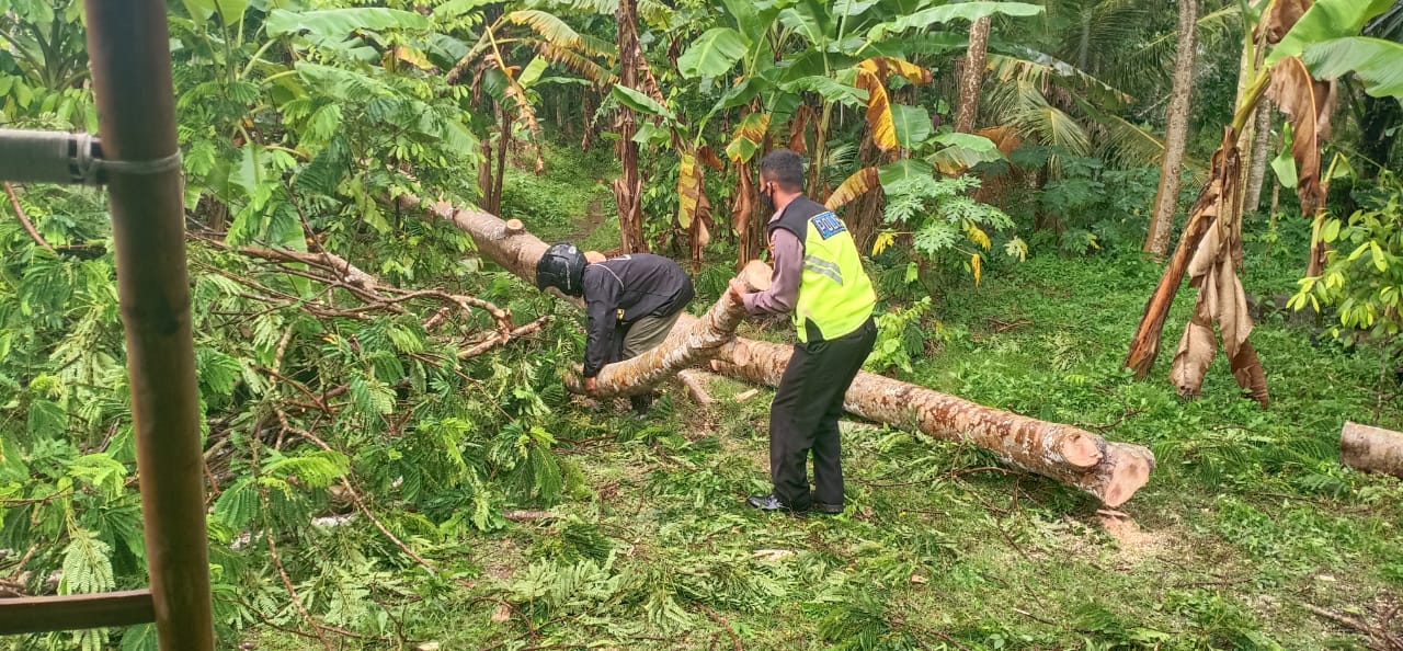 Petugas patroli Sabhara Polsek Banjar dengan peralatan gergaji senso bersama personil BPBD Kota Banjar, menebang pohon yang roboh serta membersihkan ranting-ranting di sekitar halaman rumah tersebut.