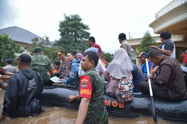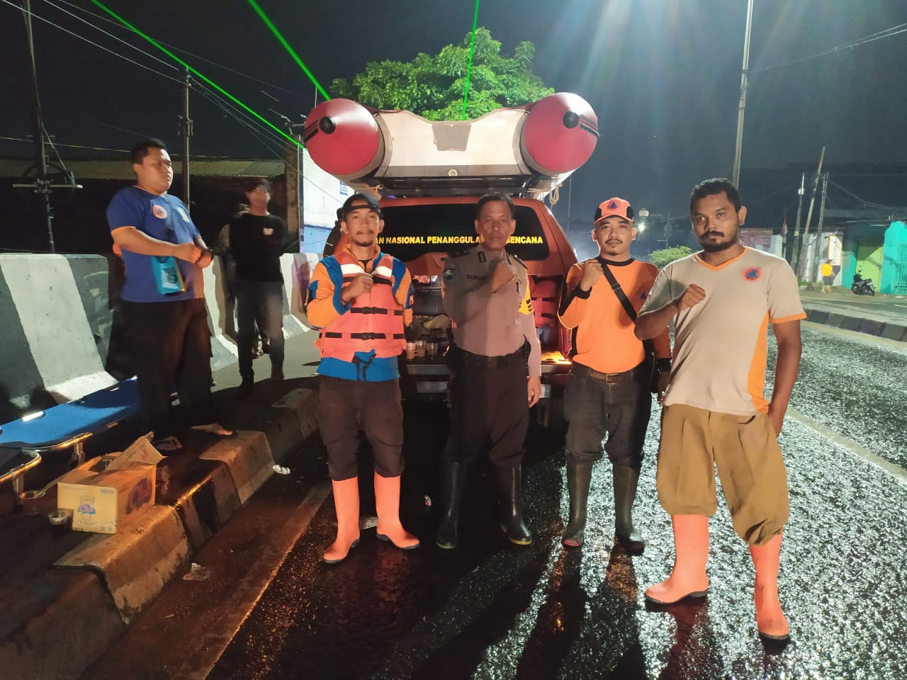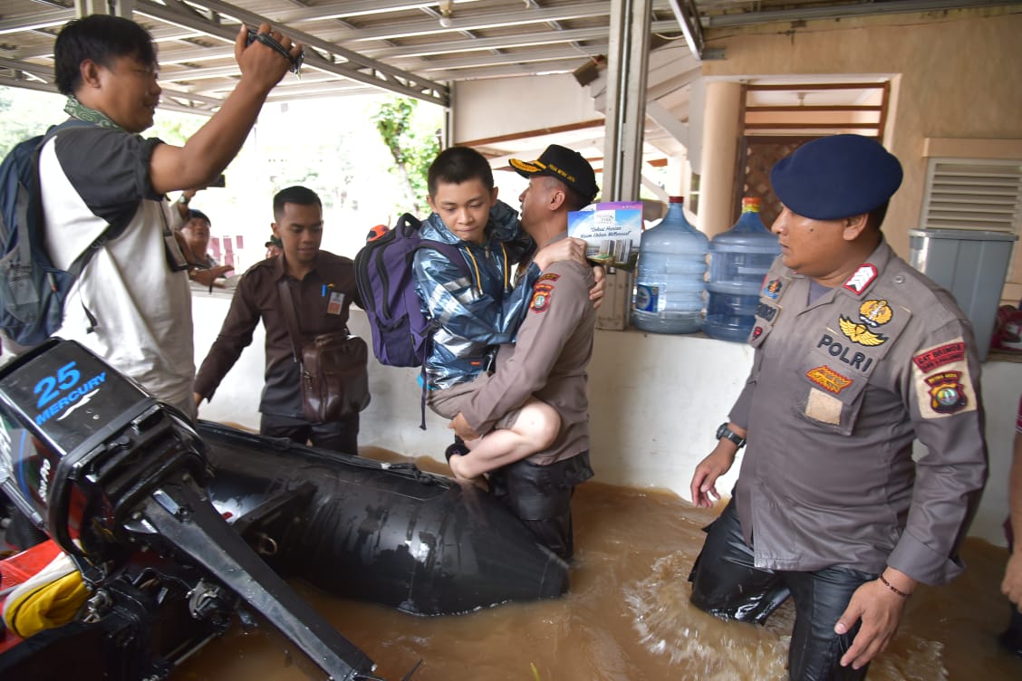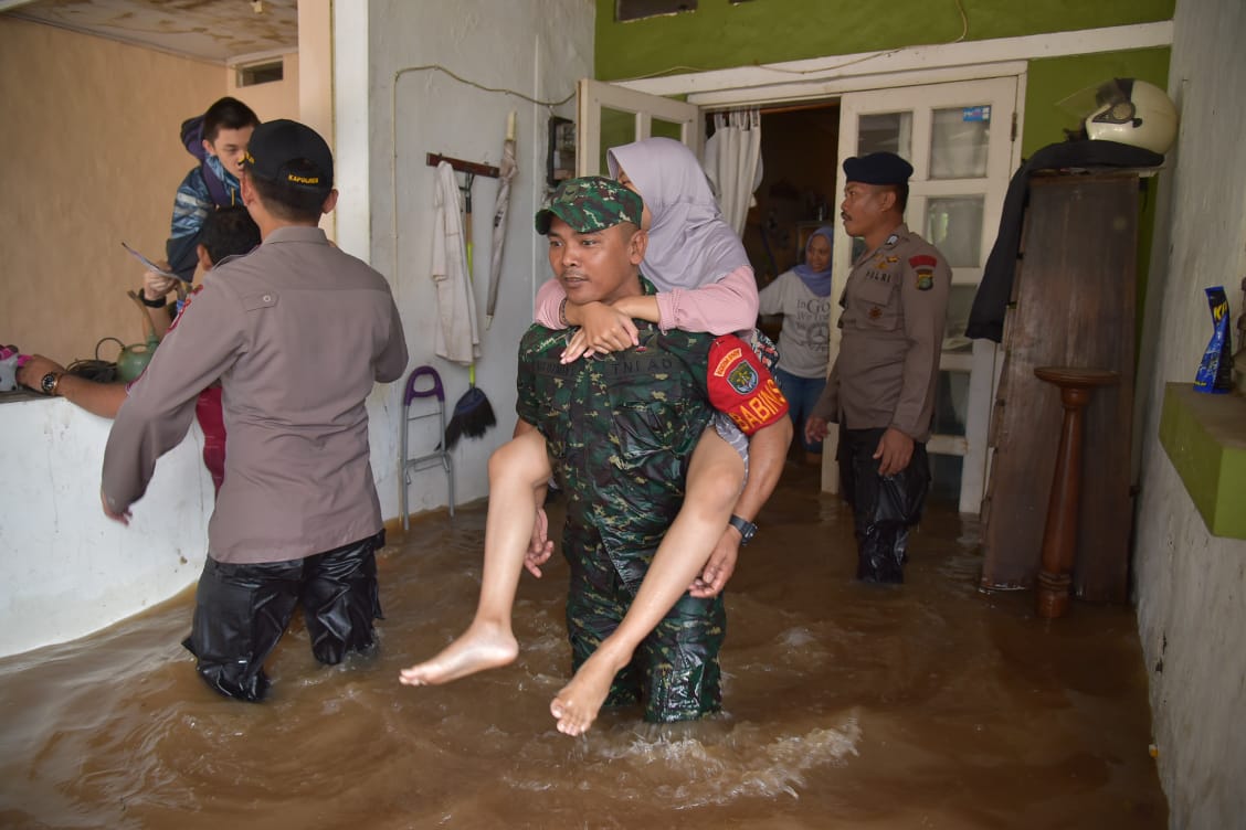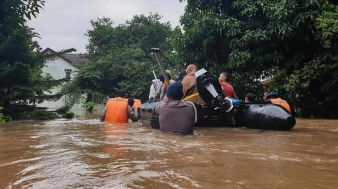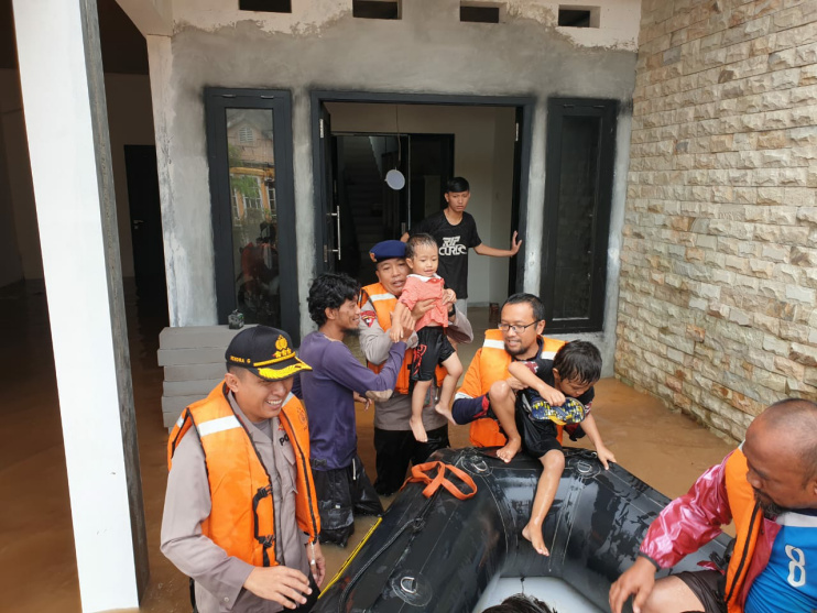 Warga yang terjebak banjir di Parung Lesang mendapat bantuan evakuasi dari petugas BPBD Kabupaten Bekasi dan Tim SAR Batalyon D Satuan Brimob Polda Metro Jaya yang turun langsung ke lokasi.