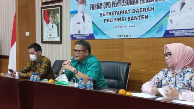 Banten, mediaotonomiindonesia.com Sekretariat Daerah Provinsi Banten menggelar Forum Organisasi Perangkat Daerah (OPD) guna membahas Rancangan Rencana Pembangunan Daerah (RPD) Provinsi Banten Tahun 2023-2026 dan Rencana Kerja Pemerintah Daerah (RKPD) Provinsi Banten 2023, Kamis 24 Februari 2022 di Ruang Rapat Sekretariat Daerah Provinsi Banten, KP3B, Kota Serang. Hadir dalam kesempatan tersebut, Asisten Pemerintahan dan Kesra, Septo Kalnadi, Asisten Perekonomian dan Pembangunan, M. Yusuf, Asisten Administrasi Umum Deni Hermawan dan para Kepala Biro di Lingkungan Sekreatariat Daerah Provinsi Banten. Rapat Forum OPD Setda Provinsi Banten dilaksanakan secara hybrid, gabungan yang hadir langsung dan secara virtual.