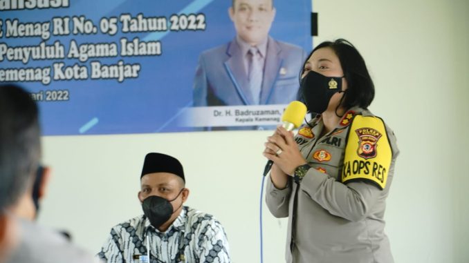 Banjar, mediaotonomiindonesia.com – Kapolres Banjar AKBP Ardiyaningsih didampingi Kepala Kantor Kemenag Kota Banjar Dr. H. Badruzaman., M.Pd sosialisasi dan edukasi Surat Edaran (SE) Menteri Agama Republik Indonesia Nomor 05 Tahun 2022 bagi para Kepala KUA, Penghulu, dan Penyuluh Agama Islam Di Lingkungan Kemenag Kota Banjar serta sosialisasi terkait vaksinasi berlokasi di Aula AZ-Zahra Darul Huda Putri Desa Balokang Kecamatan Banjar Kota Banjar, Kamis (23/2/2022).