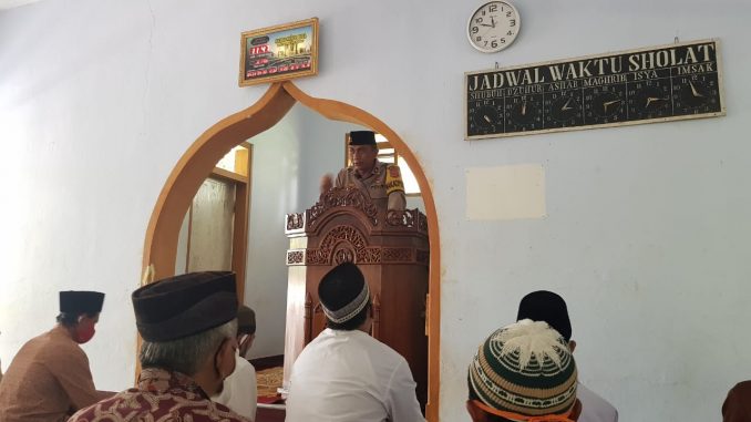 BANJAR, MEDIA OTONOMI INDONESIA – Wakapolres Banjar Kompol L. Wira Sutriana usai shalat jum’at di Masjid Nurul Huda Dusun Sukamaju Desa Mulyasari Kecamatan Pataruman Kota Banjar didampingi Bhabinkamtibmas Desa Mulyasari Brigadir Debi, dan Paur Subbag Humas Bripka Nandi Darmawan menyampaikan himbauan protokol kesehatan dan PPKM Skala Mikro kepada jemaah masjid, Jum’at (26/2/2021).