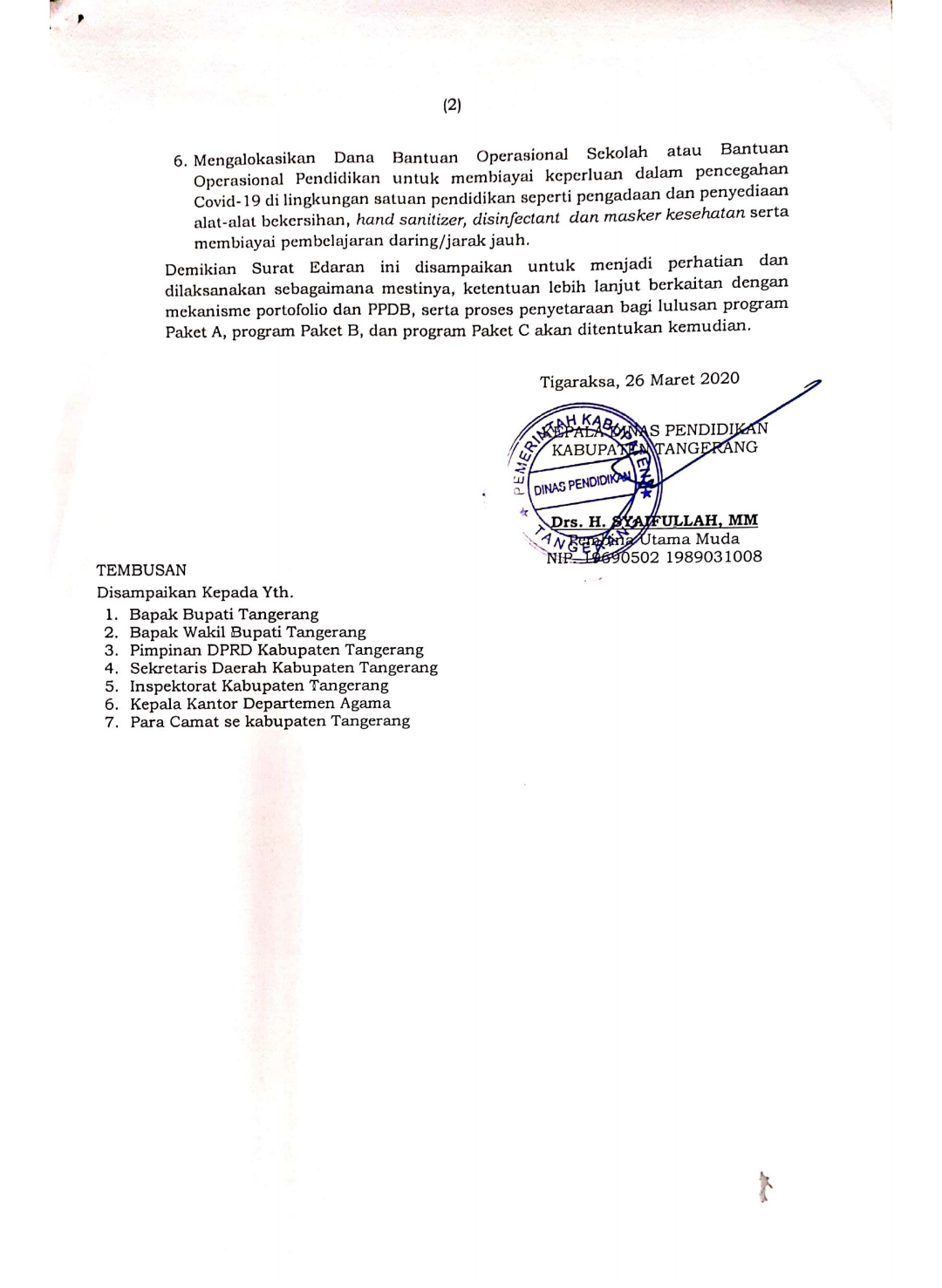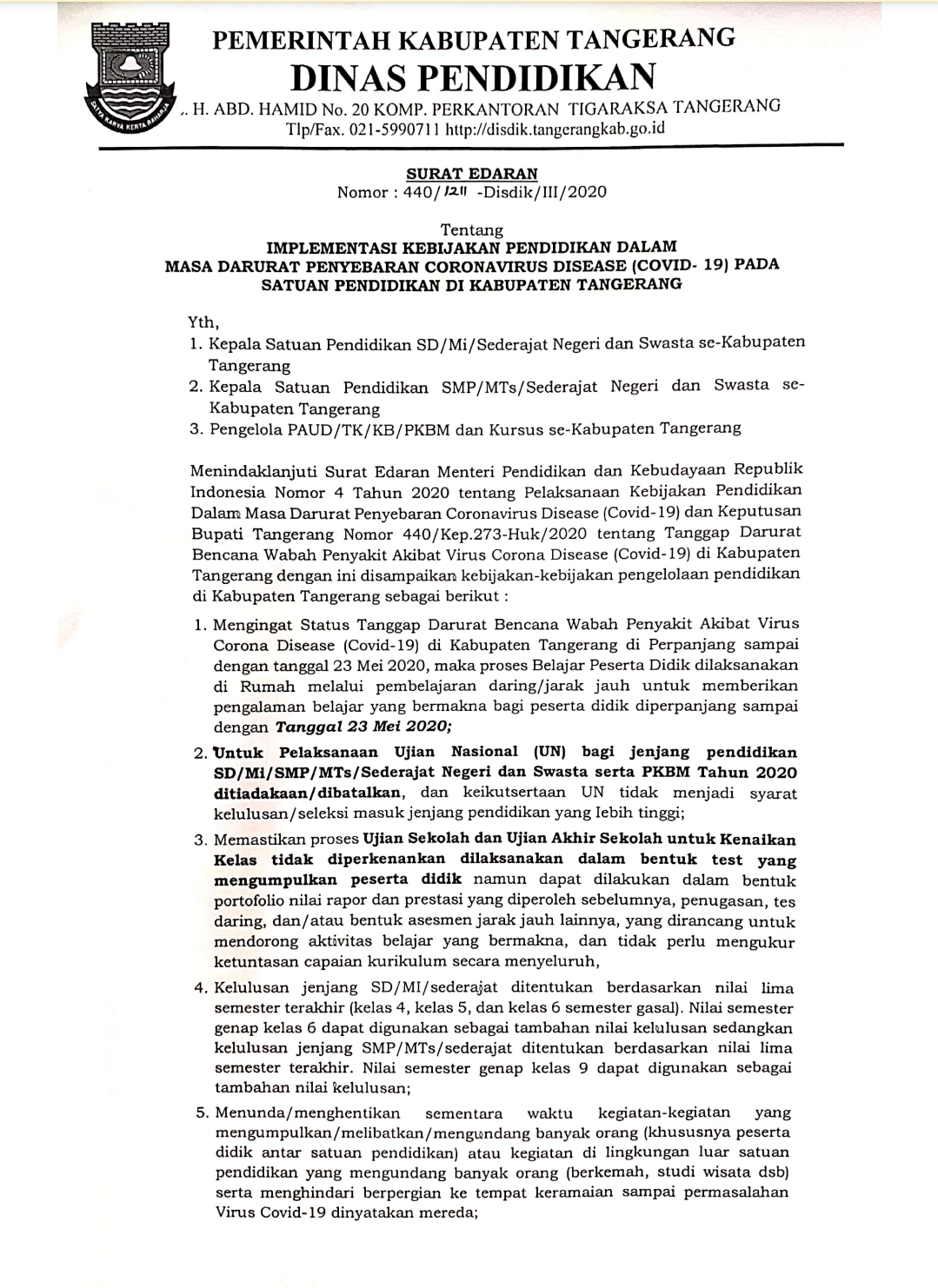 TANGERANG, MOI – Dinas Pendidikan Kabupaten Tangerang, Banten, memperpanjang sekolah di rumah selama dua bulan mulai tanggal 30 Maret sampai 23 Mei 2020 dari sebelumnya hanya dua minggu.