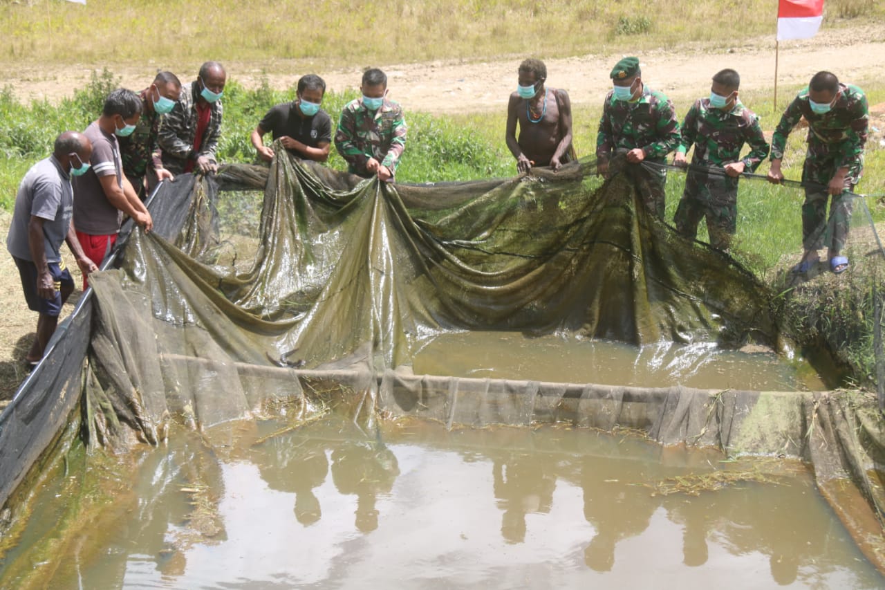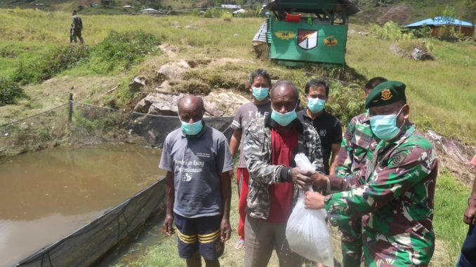 MBUA/PAPUA, MEDIA OTONOMI INDONESIA – Dalam rangka HUT Ke-70 TNI, Satgas Pamtas Mobile Yonif Raider 323/BP Kostrad membagikan 1000 ekor bibit ikan lele kepada pendeta yang ada di kampung Mbua Kabupaten Nduga Papua, Sabtu (26/9/2020).