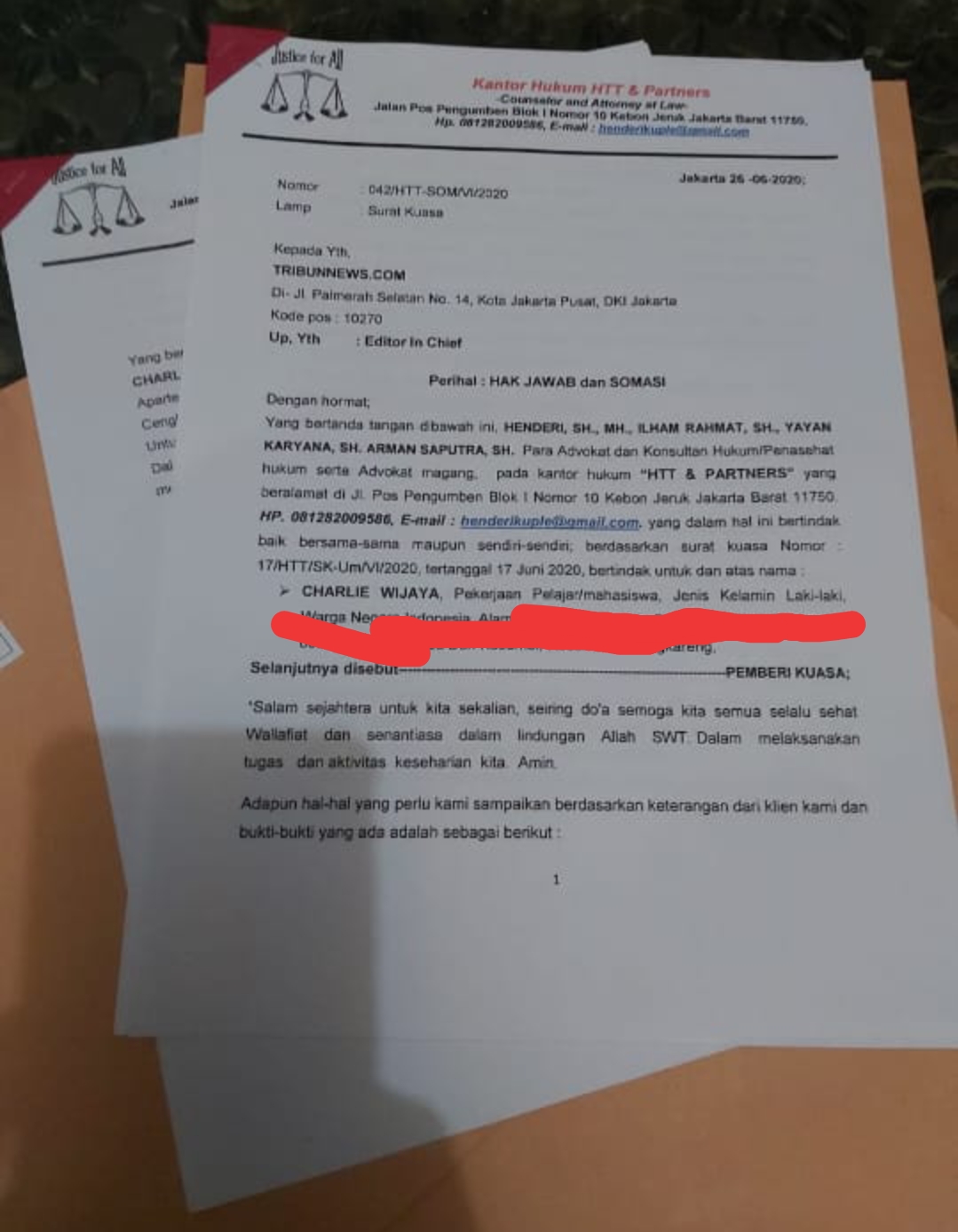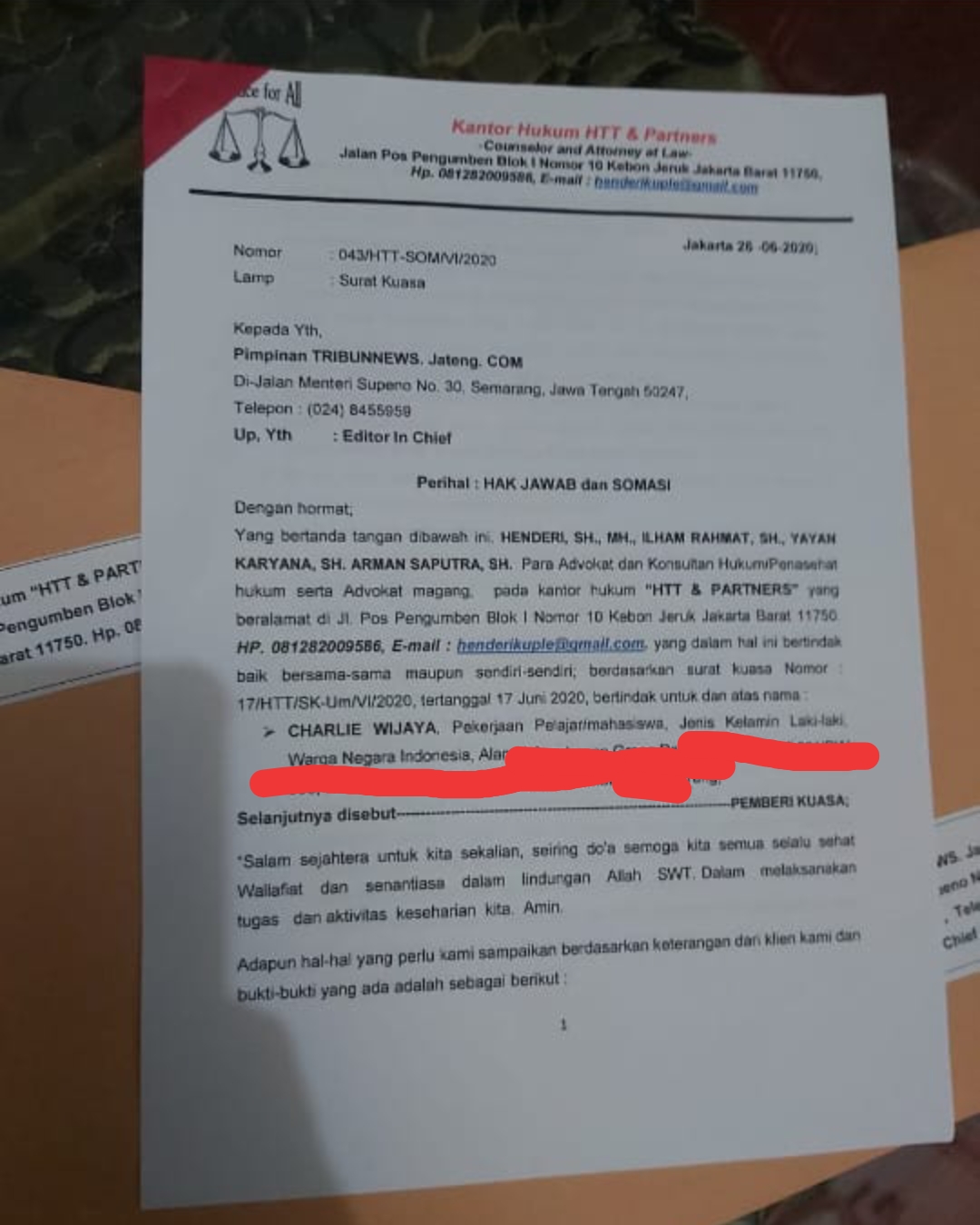 Jakarta, mediaotonomiindonesia.com -Melalui informasi dari kuasa hukum Charlie Wijaya, “HTT & PARTNERS” yang berkedudukan di Jakarta Barat  beranggotakan Henderi SH, MH, Ilham Rahmat SH, Yayan Karyana, SH, Arman Saputra SH membenarkan bahwa Charlie Wijaya somasi Tribunjateng.com dan Tribunenews.com, dimana pada hari 16 Juni 2020 Tribunjateng.com memberitakan dengan artikel : Kader PSI CHARLIE WIJAYA meminta Maaf Tuduh Bintang Emon  Pakai Narkoba, dan