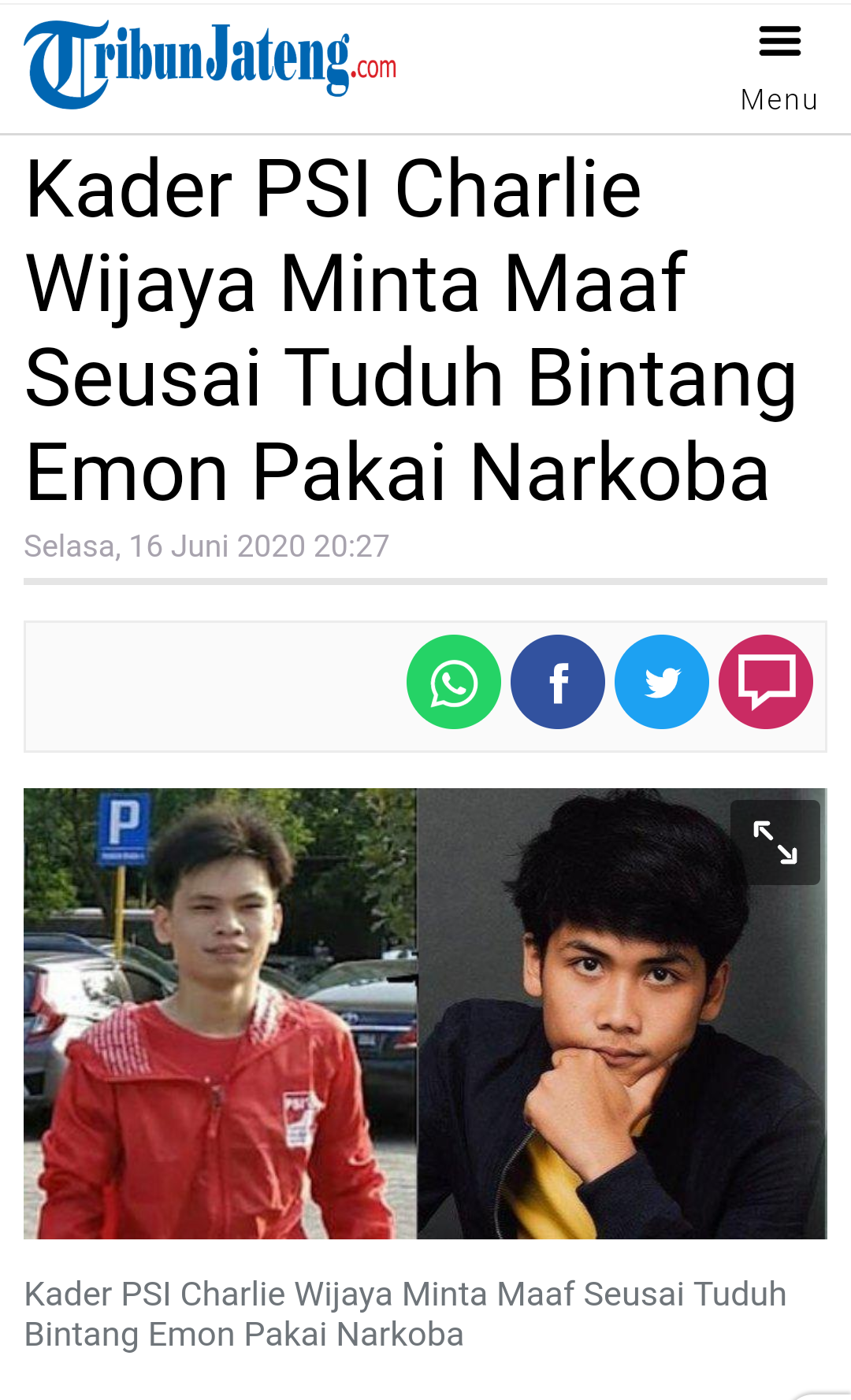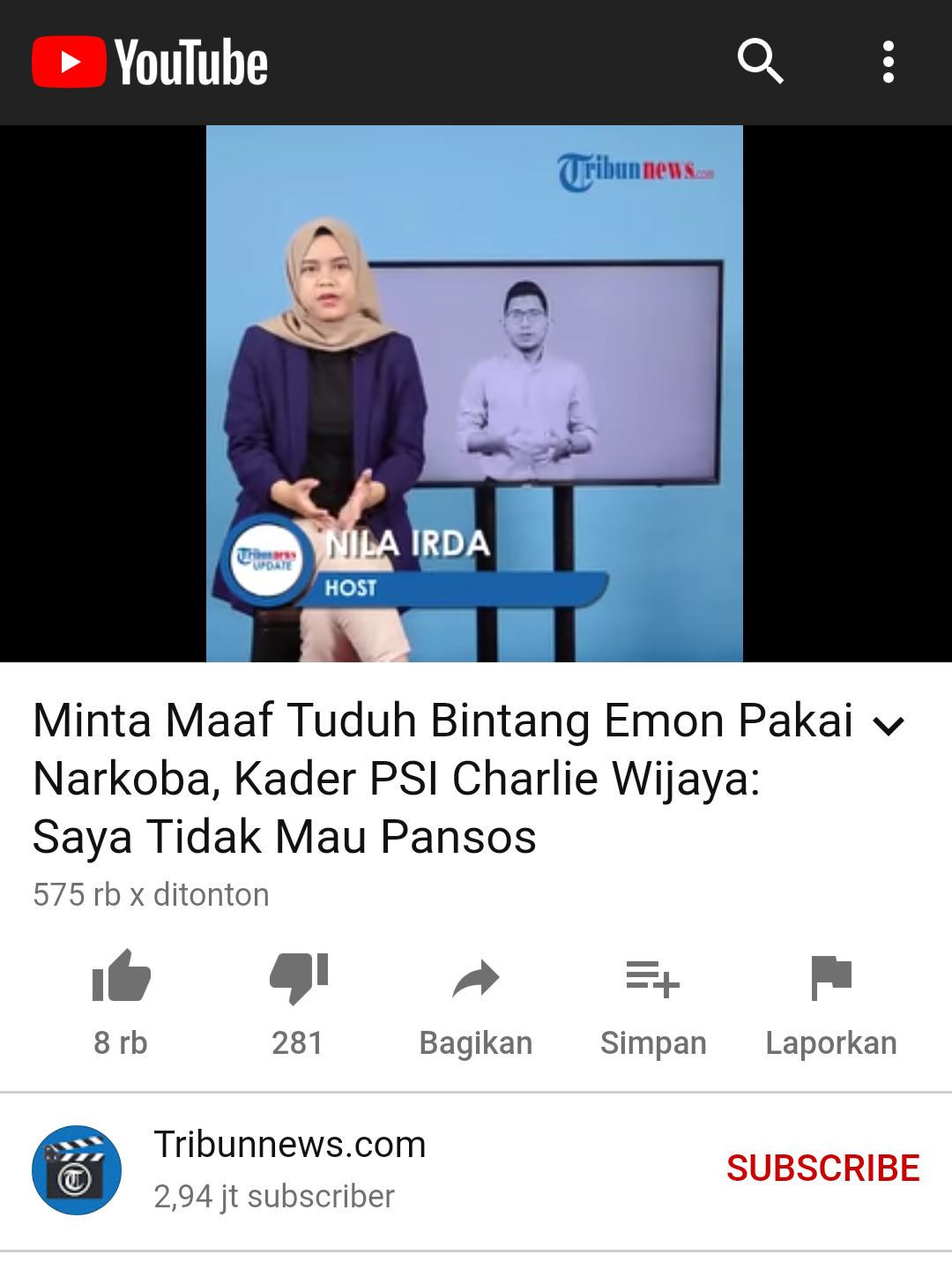 Tribunenews.com pada 17 Juni 2020 dalam pemberitaannya melalui youtube yang berjudul : Minta Maaf Tuduh Bintang Emon Pakai Narkoba, Kader PSI Charlie Wijaya.