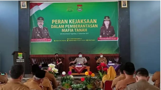 Tangerang, mediaotonomiindonesia.com – Kejaksaan Negeri (Kejari) Tangerang melakukan sosialisasi pemberantasan mafia tanah. Sosialisasi ini dihadiri para peserta Kepala Desa (Kades), Lurah Se-Kecamatan Tigaraksa di Gedung Serbaguna, Kecamatan Tigaraksa, Kabupaten Tangerang, Banten. Senin (27/12/2021)